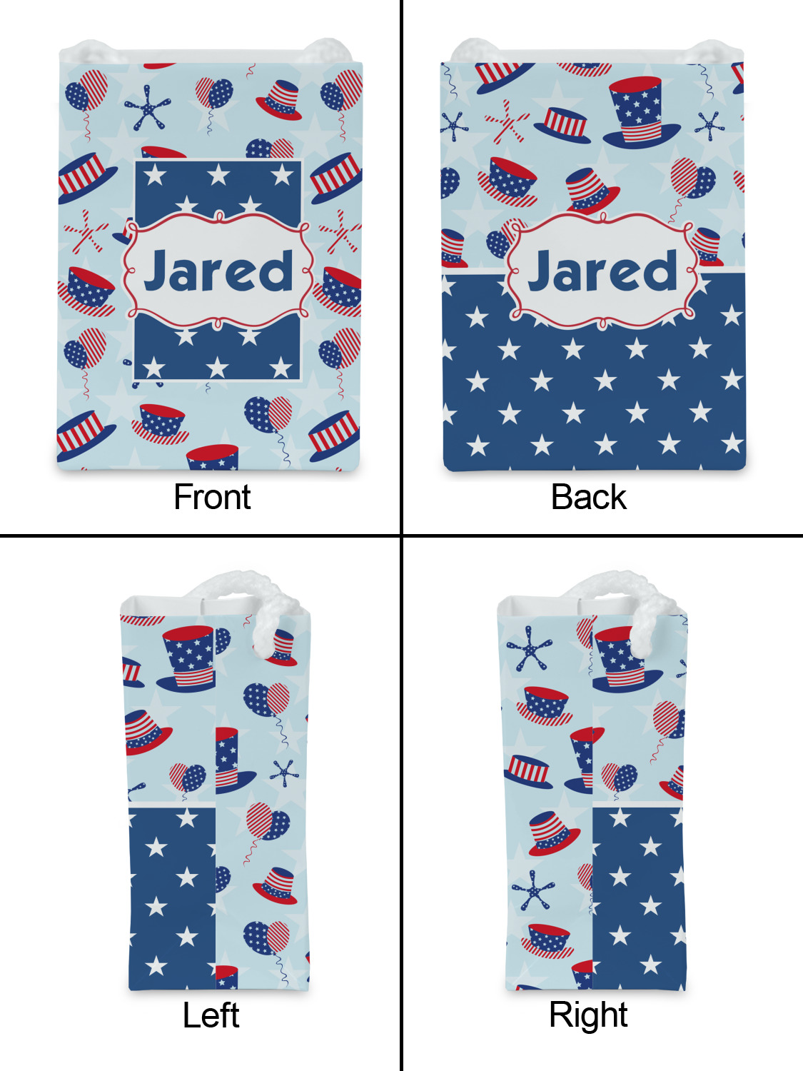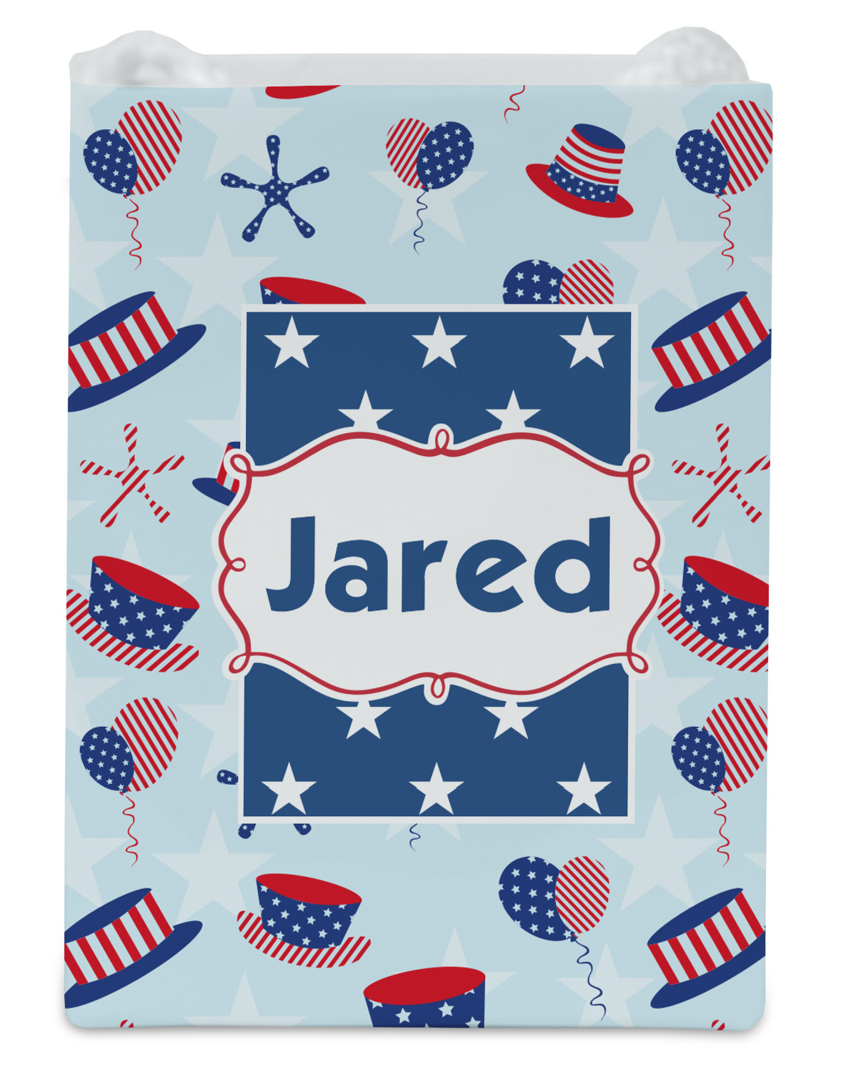 Patriotic Celebration is a fun pattern with red, white, and blue striped and starred hats and balloons. The light blue background really makes these design elements pop! A navy and white star pattern is used as a secondary pattern to add some contrast.