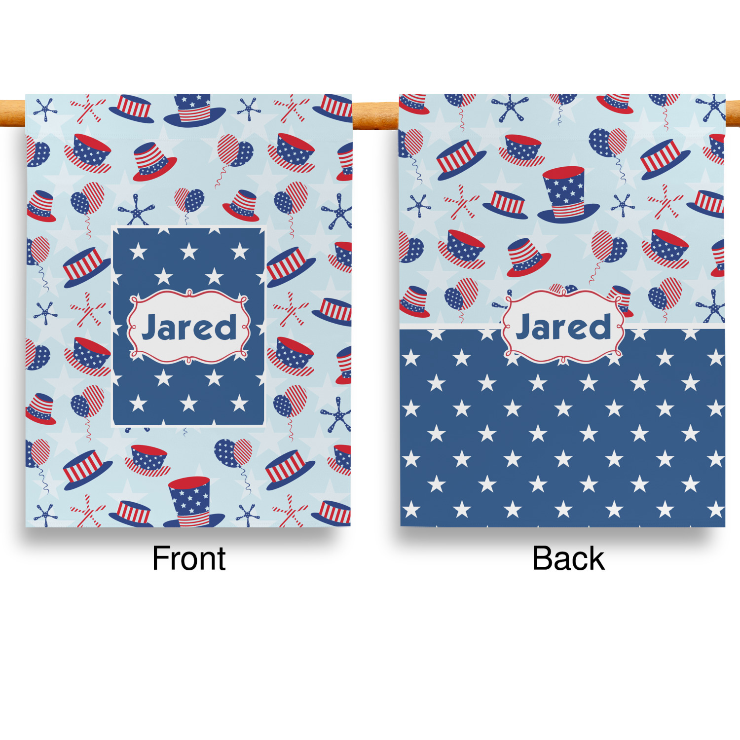 These custom garden flags are made of a durable, double-ply, polyester weave, allowing them to withstand the elements year round. The small flags measure at approximately 12 by 18 inches. The large flags measure out to 28 by 37 inches. You can order these decorative flags with your customization printed on the front only, or the front and back.