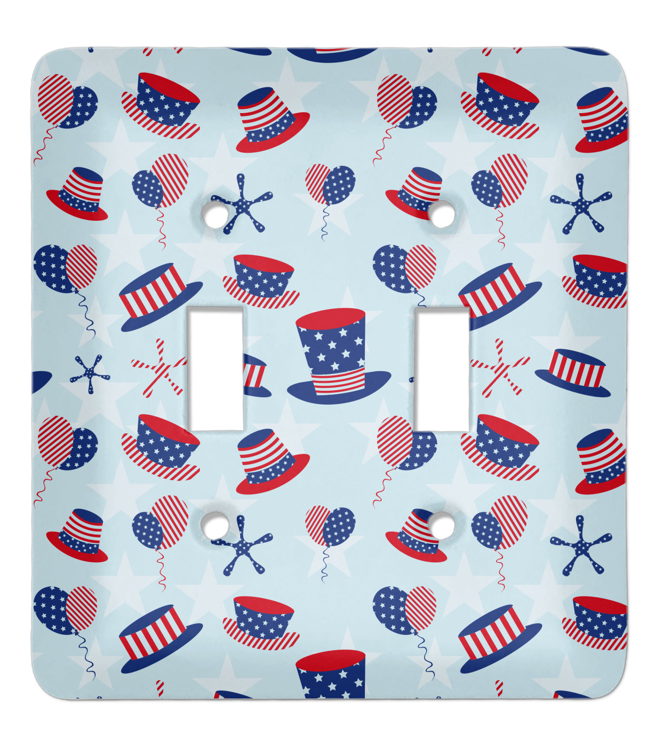 Patriotic Celebration is a fun pattern with red, white, and blue striped and starred hats and balloons. The light blue background really makes these design elements pop! A navy and white star pattern is used as a secondary pattern to add some contrast.