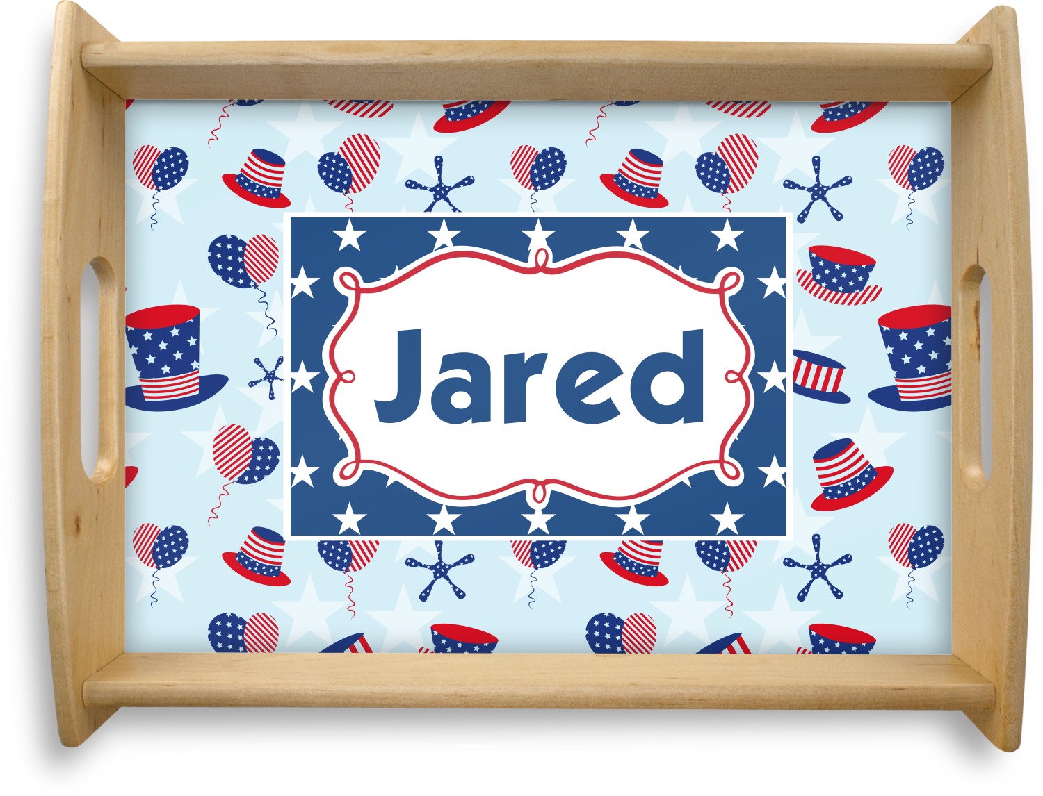 This serving tray with handles features square edges and two rounded sides, creating a very modern look. Each side is fabricated from a beautifully cut, natural wood. The bottom of the interior of the tray displays your customized design in bright, vibrant color. The tray is sold in both a black color and a natural wood look. Each variation of the wood serving tray has two sizes: Small, which is 14" x 10" x 2.25", and Large, which is 19.5" x 13.5" x 2.75".