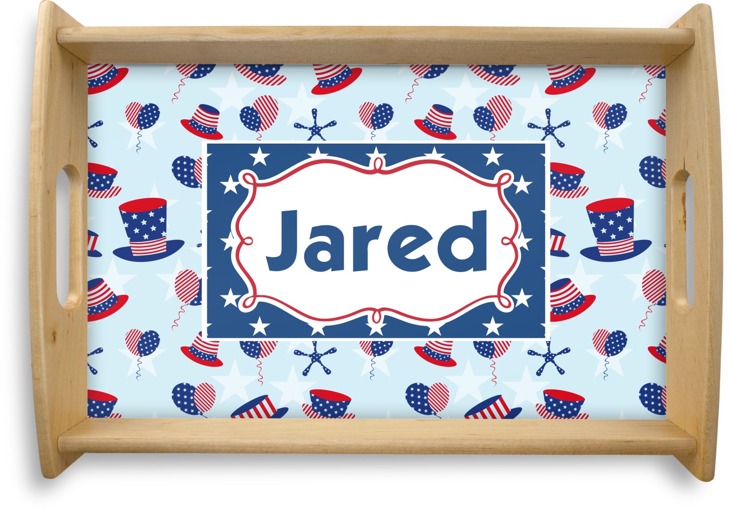 This serving tray with handles features square edges and two rounded sides, creating a very modern look. Each side is fabricated from a beautifully cut, natural wood. The bottom of the interior of the tray displays your customized design in bright, vibrant color. The tray is sold in both a black color and a natural wood look. Each variation of the wood serving tray has two sizes: Small, which is 14" x 10" x 2.25", and Large, which is 19.5" x 13.5" x 2.75".