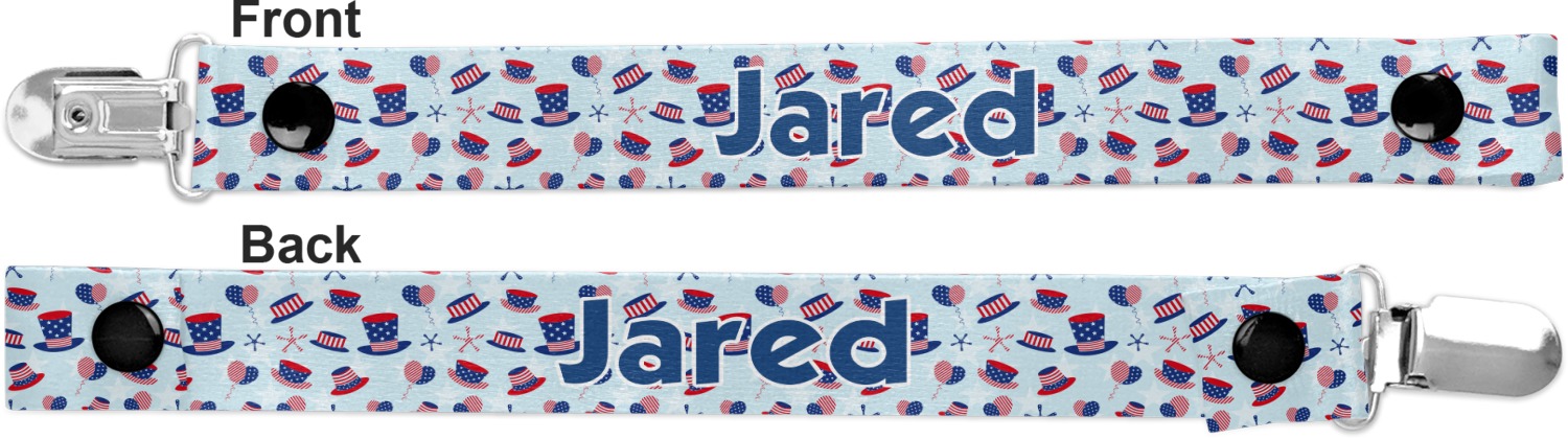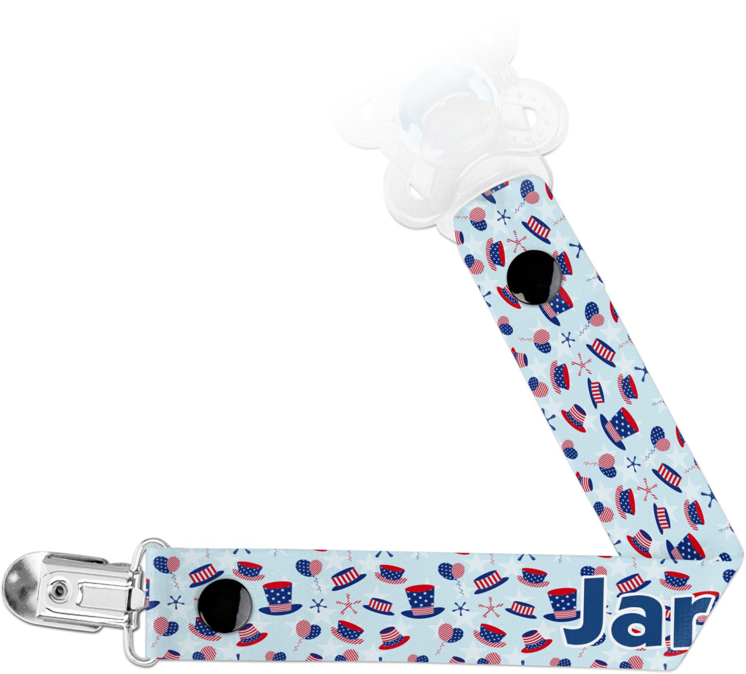 This personalized pacifier clip is the ideal size and measures at approximately 7.5 inches in length, when either end is snapped closed. On one end, you'll find a snap button. This button of your baby's pacifier holder is what can be attached to their pacifier to hold is securely in place. Simply open the snap, slip it through the pacifier opening, and snap it back into place. On the opposite end of this baby pacifier holder, you'll find a metal clip that can secure to a baby's collar or sleeve. This clip ensures that the strap stays in place, and that your baby's pacifier is always on hand.