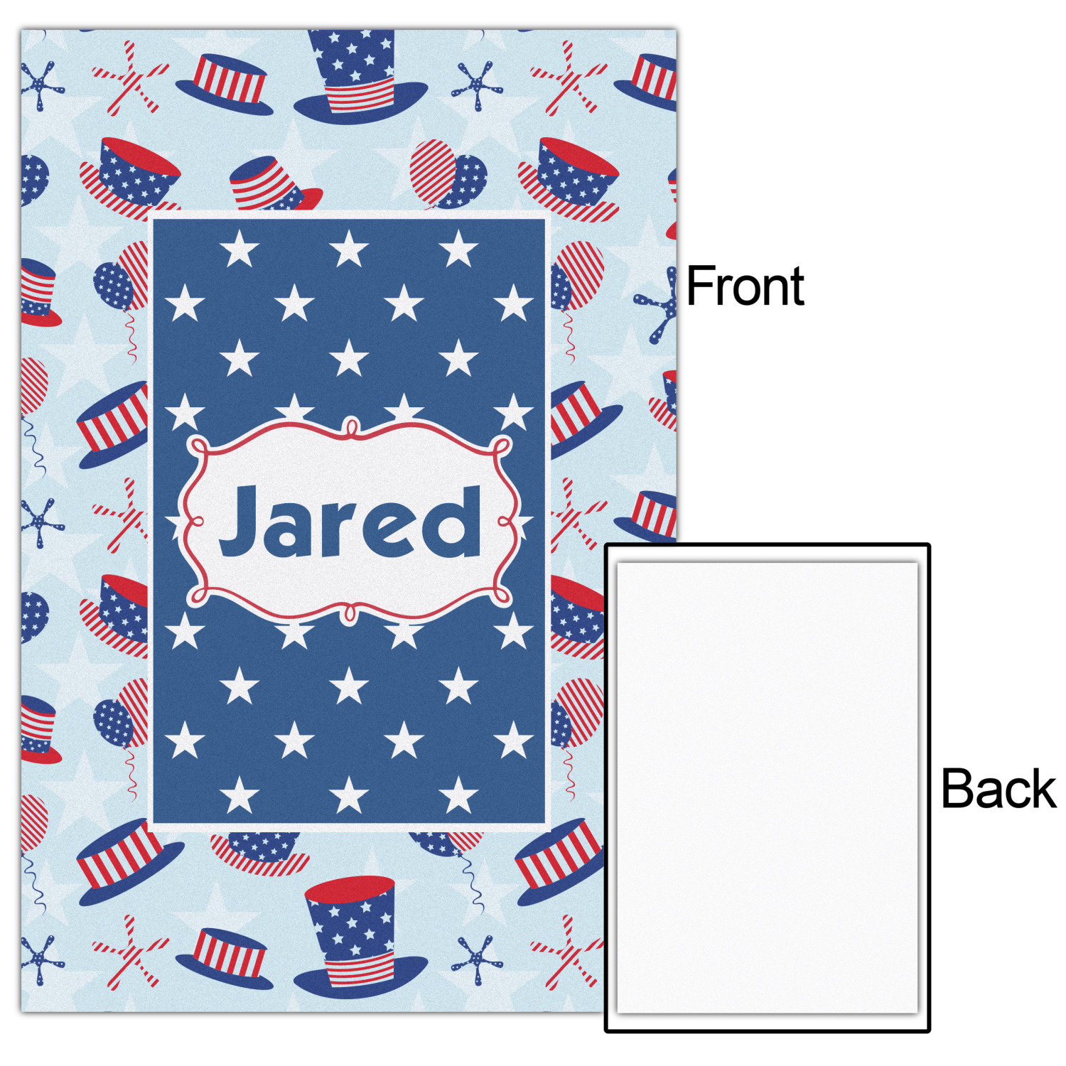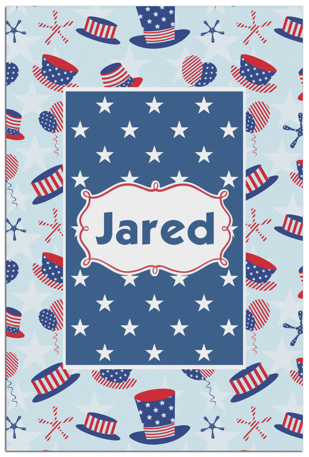 Patriotic Celebration is a fun pattern with red, white, and blue striped and starred hats and balloons. The light blue background really makes these design elements pop! A navy and white star pattern is used as a secondary pattern to add some contrast.