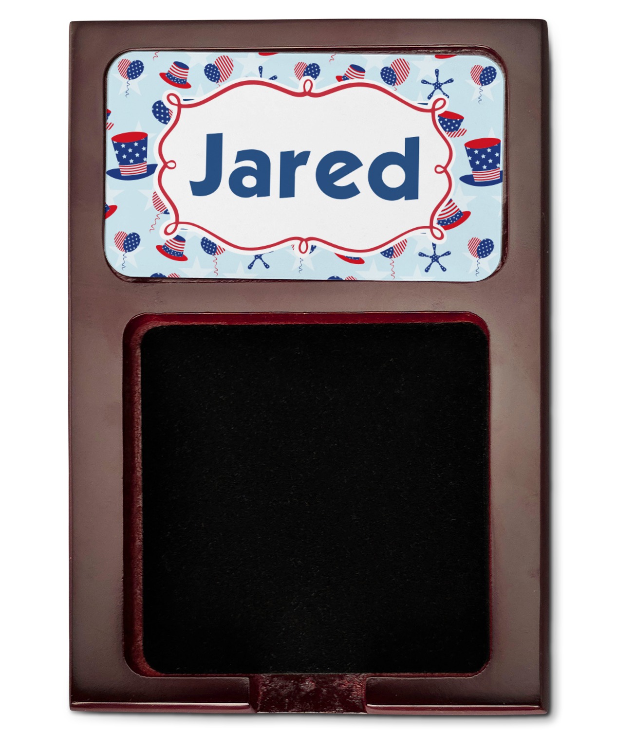 Crafted from a fine mahogany, this post it note holder is in the shade of a dark, cherry color. The dispenser itself is about 4.25 by 6.25 by 0.75 inches. You can place your 3 by 3 inch sticky notes in the indentation below the nameplate. We print your customization onto the nameplate that rests above the velvety indentation.