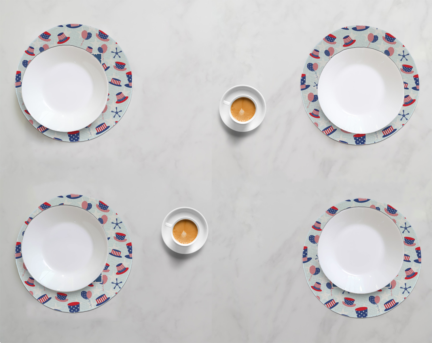 Patriotic Celebration is a fun pattern with red, white, and blue striped and starred hats and balloons. The light blue background really makes these design elements pop! A navy and white star pattern is used as a secondary pattern to add some contrast.
