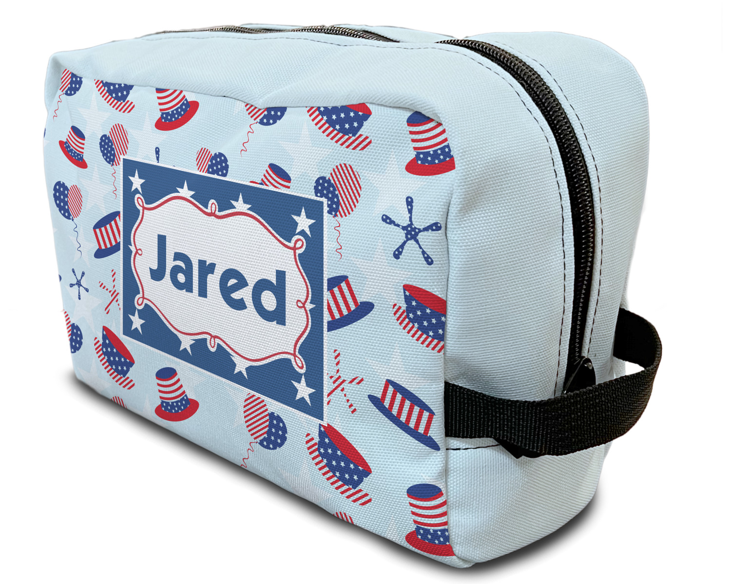 Our toiletry bag has the traditional dopp kit design i.e. a side to side zippered closure, giving you easy access to all the contents inside and a sturdy handle on one side of the bag. The canvas fabric for dopp kits is printed, then cut and sewn here in the USA.