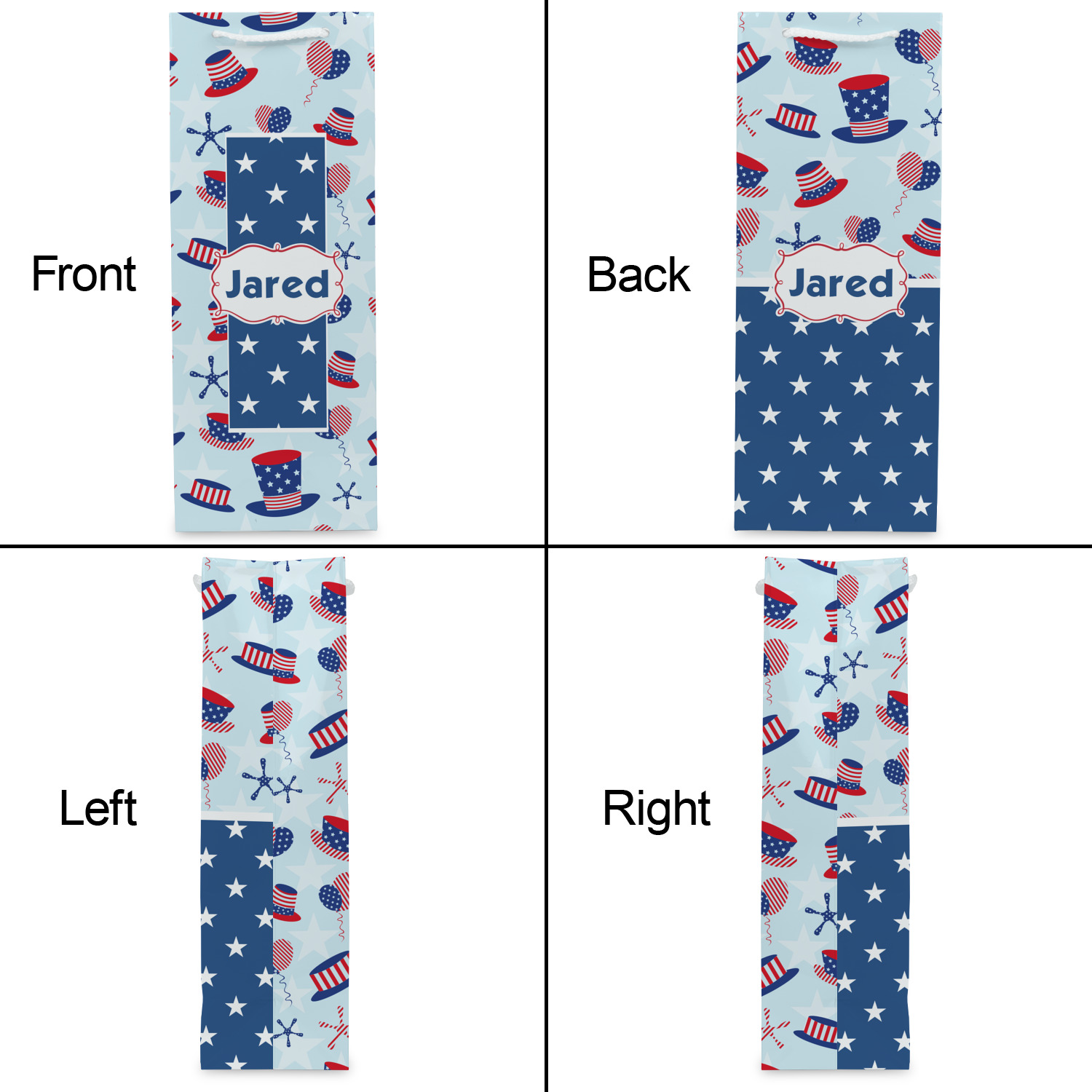 Our wine bags are printed on premium paper. The bags are then cut, scored and folded. The handles and cardstock base it attached. These custom wine bags are printed and made in the USA.
