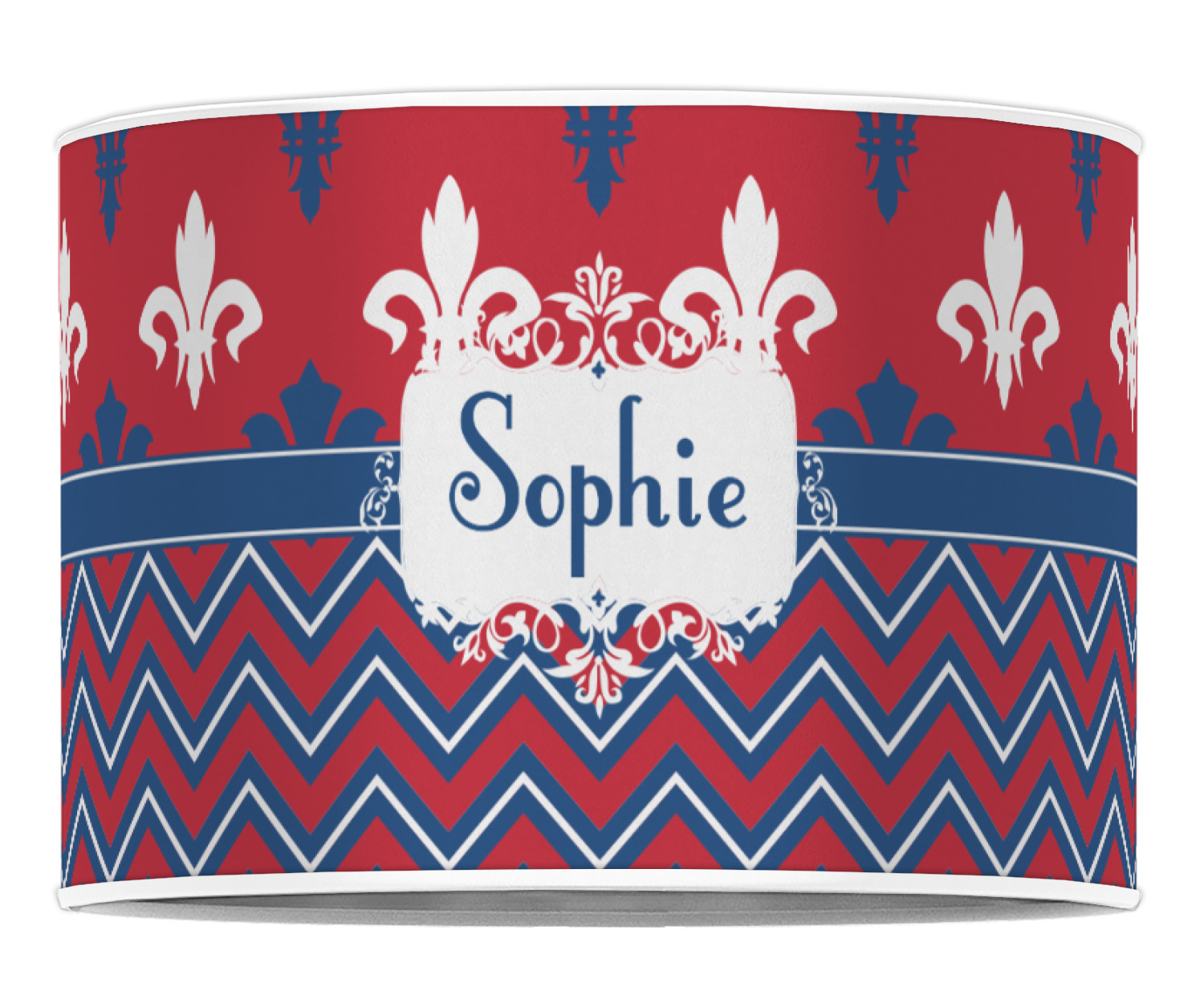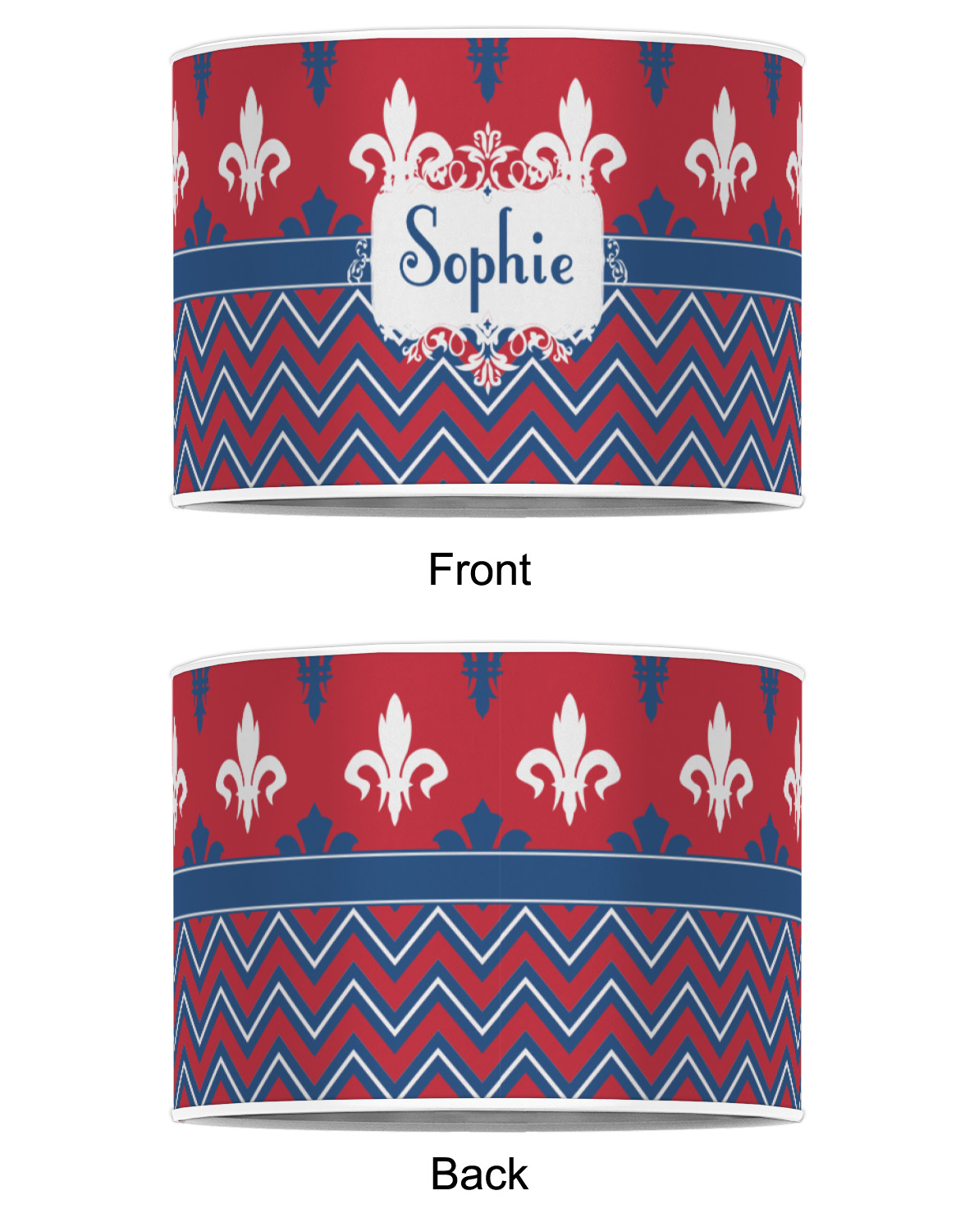 Remember the independence of our country with the Patriotic Fleur de Lis design. This design is a powerful combination of red, white, and blue. A chevron pattern nicely compliments the fleur de lis pattern with an elegant frame to hold your personalization.