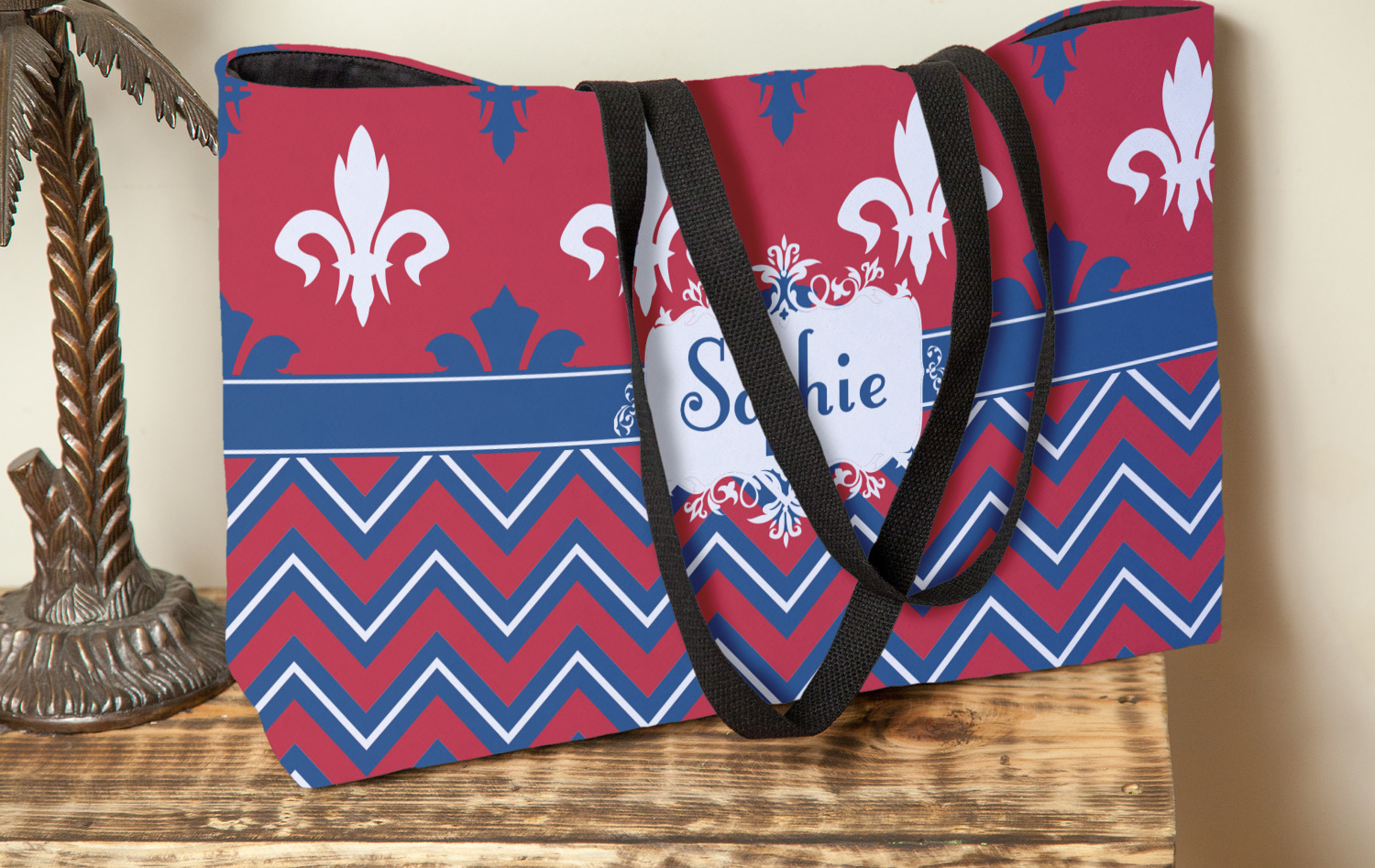 These beach totes are handmade here in the USA. Fabric is printed with your design. The tote is then sewn from the fabric pieces, lining and handles added.