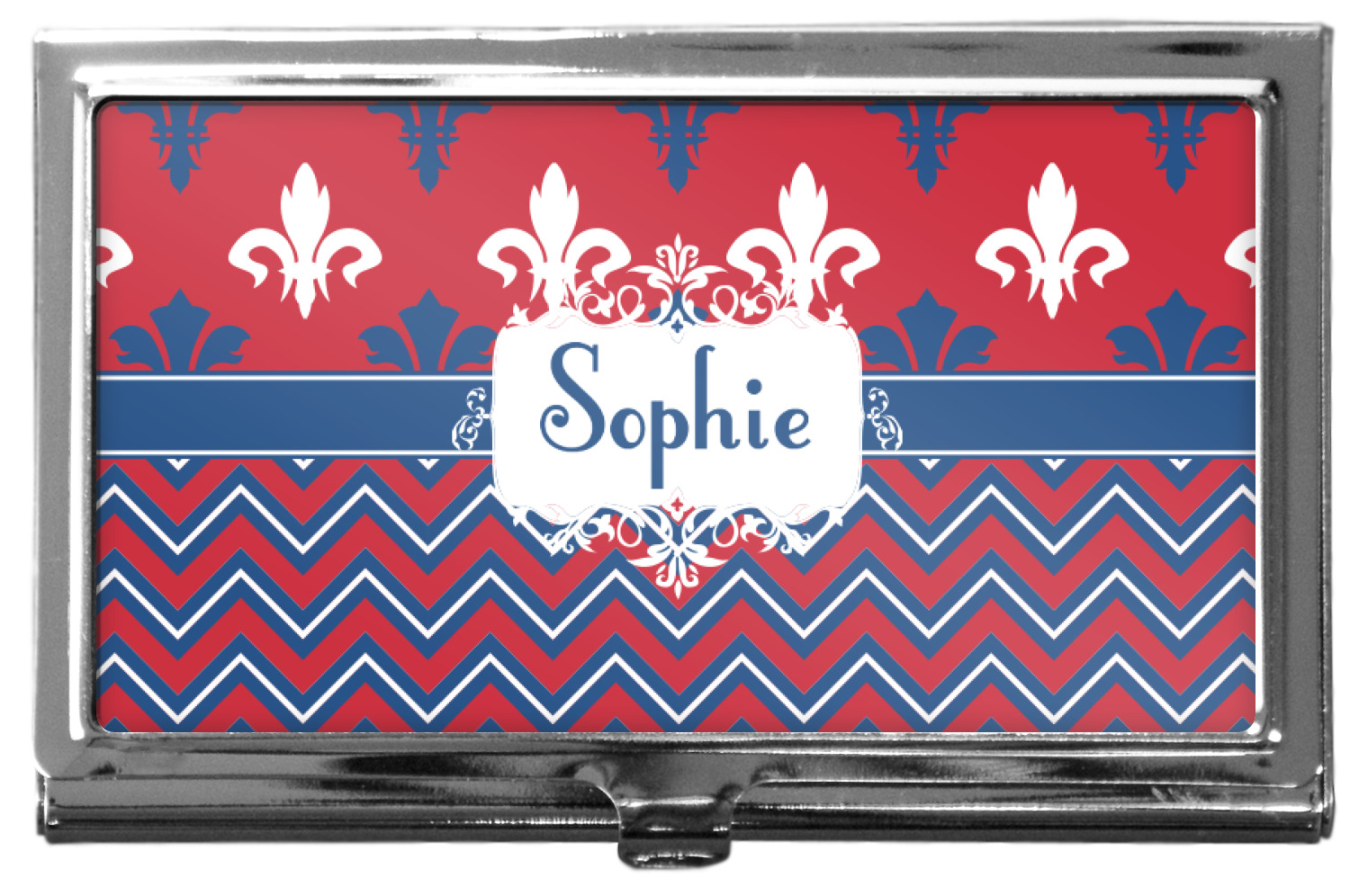 Remember the independence of our country with the Patriotic Fleur de Lis design. This design is a powerful combination of red, white, and blue. A chevron pattern nicely compliments the fleur de lis pattern with an elegant frame to hold your personalization.