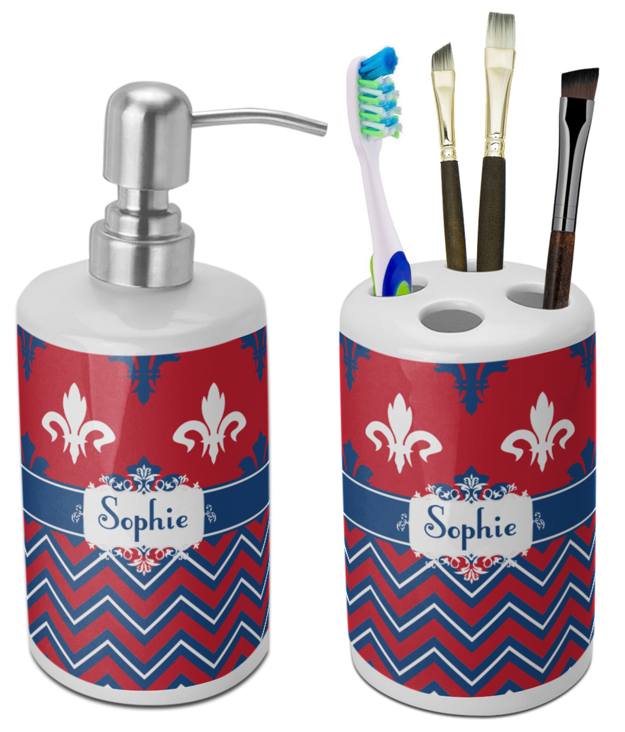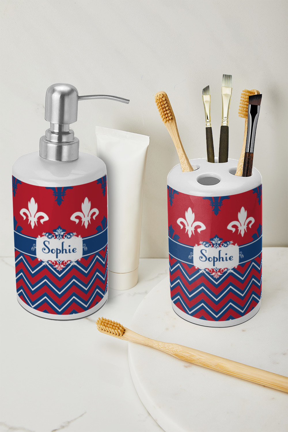 This two piece, ceramic bathroom set will add the perfect splash of color to any bathroom. This set includes one pump dispenser, ideal for soap or lotion, and one toothbrush holder with four holes. Although originally designed for toothbrushes, the holder will also hold make-up brushes, nail files, and other bathroom tools.