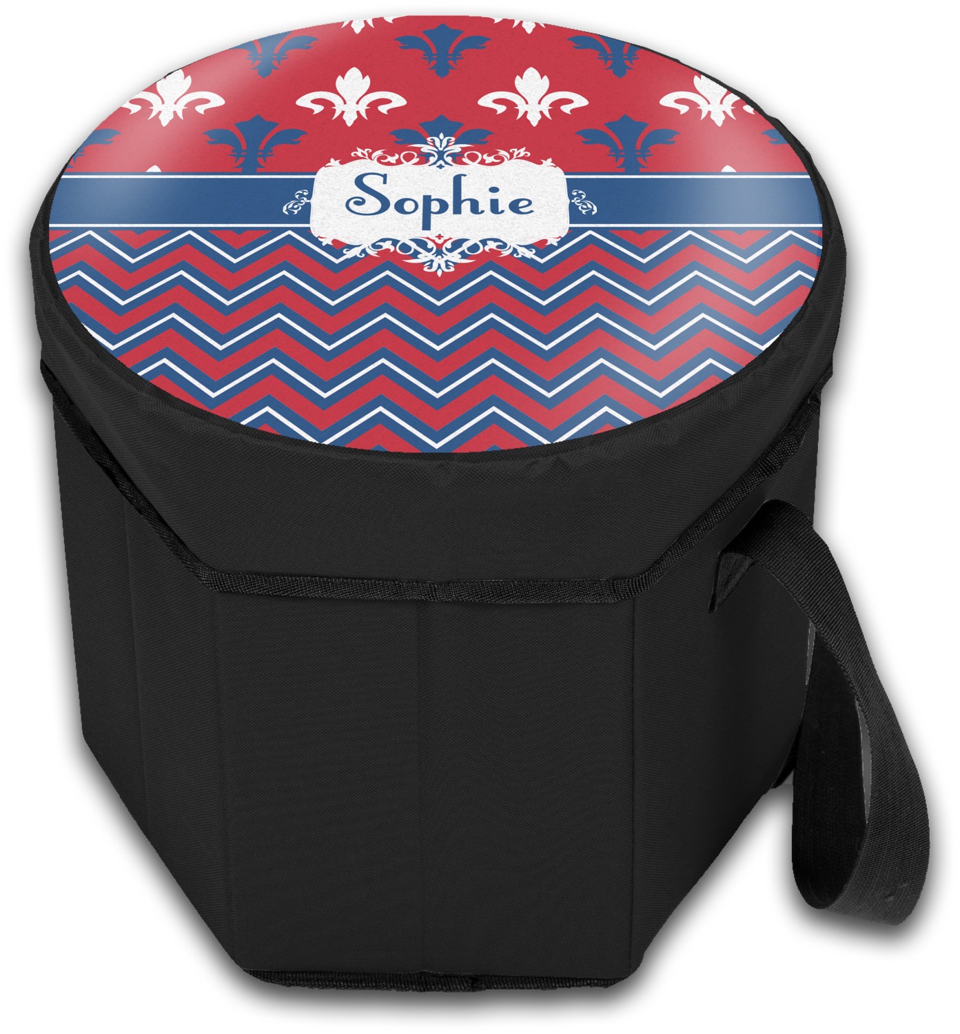 Our collapsible insulated coolers feature a unique six-sided hexagon shape, are lightweight, durable and can be turned into a seat. This cooler is fully insulated with silver foil lining to keep food and drinks hot or cold, and has a 12-quart capacity. Although this cooler collapses for easy transport, hidden inside are composition panels made of sturdy wood that give the frame strength and allow this cooler to be used as a seat. Simply sit down on the personalized cover and give your legs a break! (Maximum weight capacity of 200 pounds.)