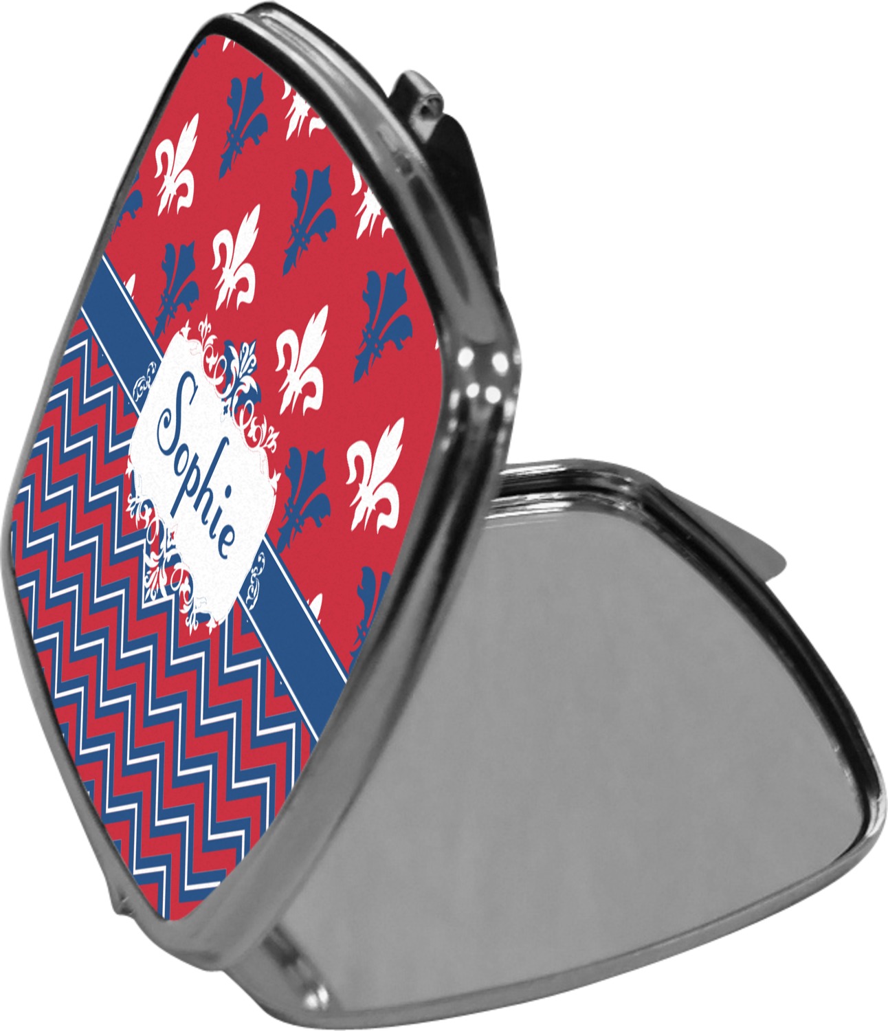 We offer many prints and patterns and many of our patterns are available in 45 different colors. You can personalized the compact mirrors with a name, a monogram or just an initial. We offer several different label, ribbon and font choices. Our customization system lets you create your very own custom & unique product and it lets you preview it before you purchase.