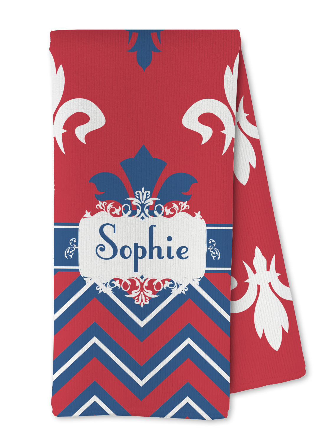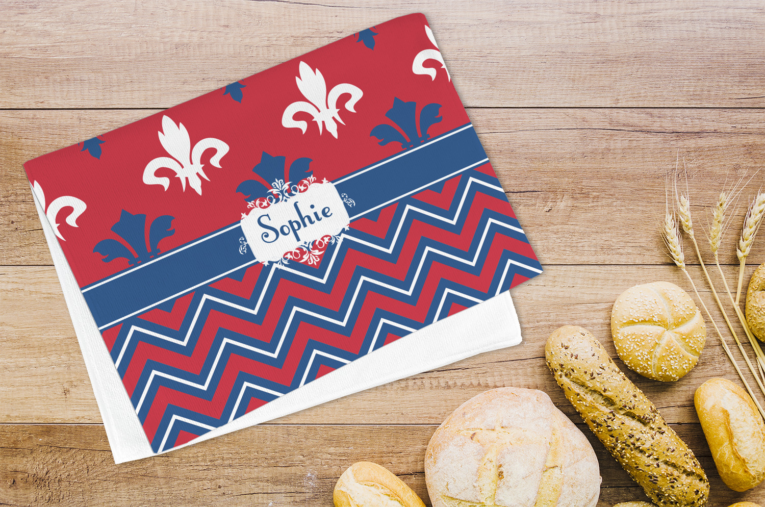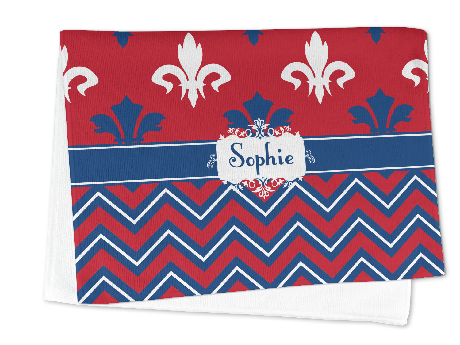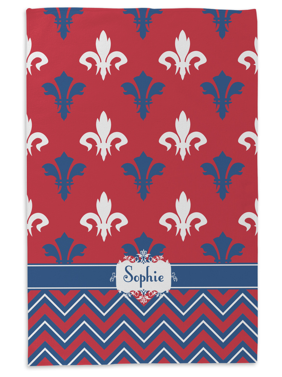 Remember the independence of our country with the Patriotic Fleur de Lis design. This design is a powerful combination of red, white, and blue. A chevron pattern nicely compliments the fleur de lis pattern with an elegant frame to hold your personalization.