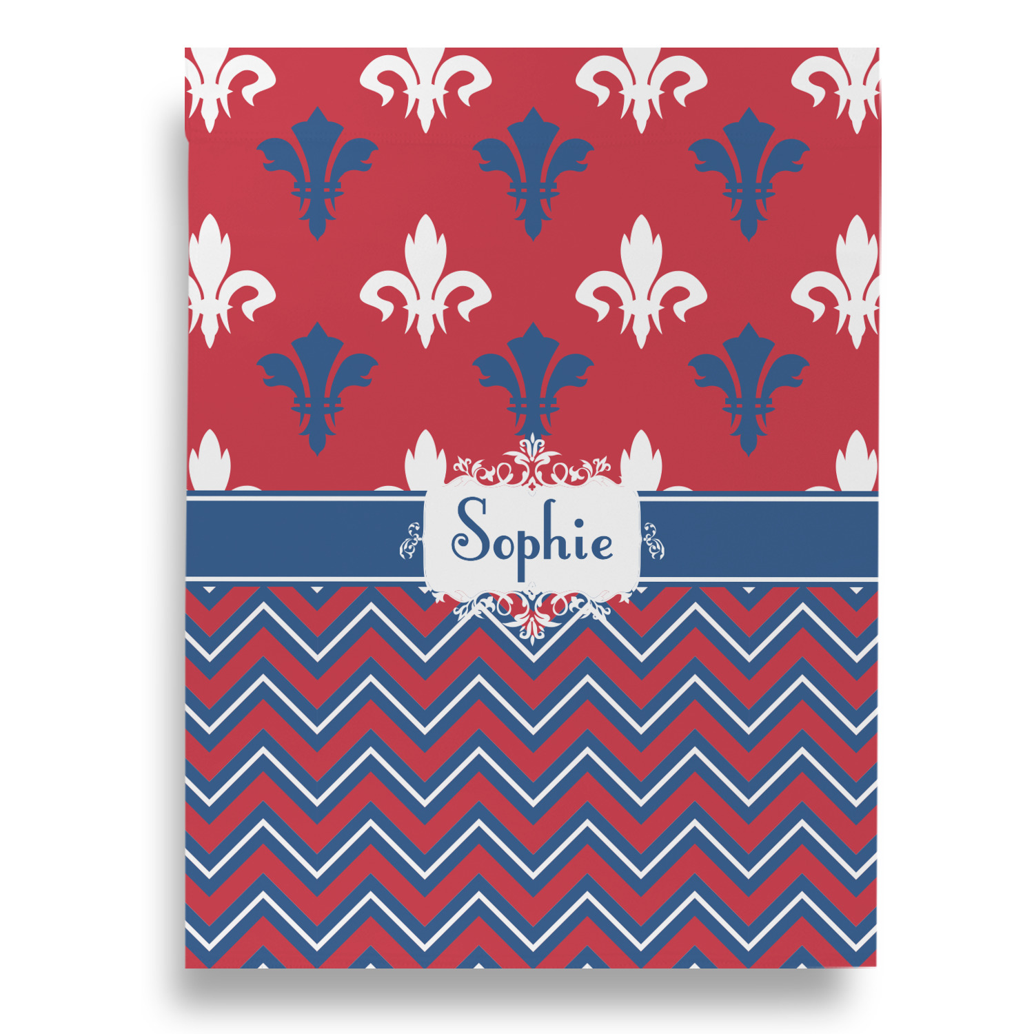 Remember the independence of our country with the Patriotic Fleur de Lis design. This design is a powerful combination of red, white, and blue. A chevron pattern nicely compliments the fleur de lis pattern with an elegant frame to hold your personalization.