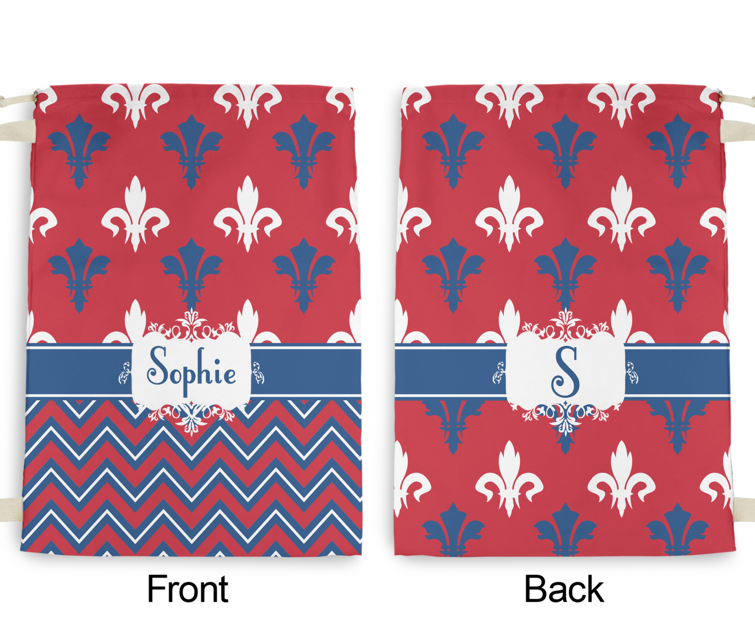 Remember the independence of our country with the Patriotic Fleur de Lis design. This design is a powerful combination of red, white, and blue. A chevron pattern nicely compliments the fleur de lis pattern with an elegant frame to hold your personalization.