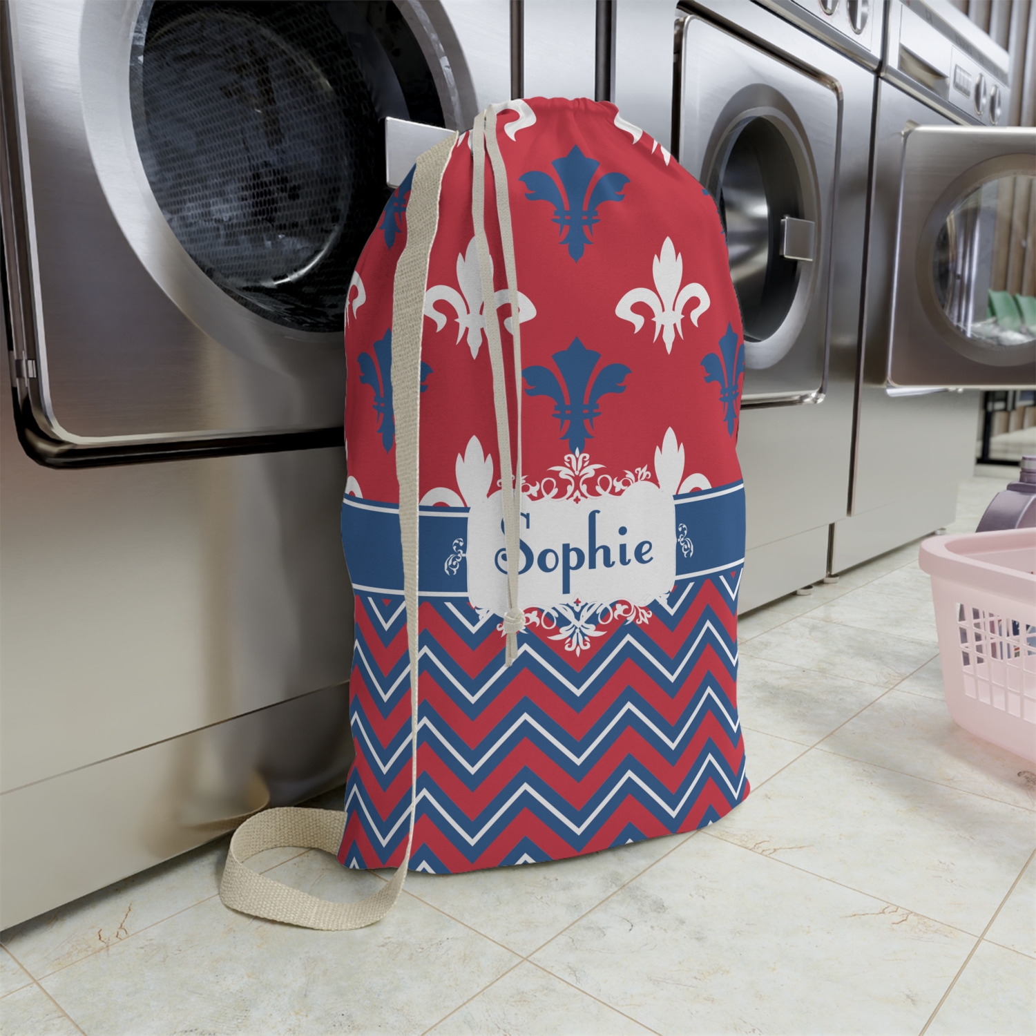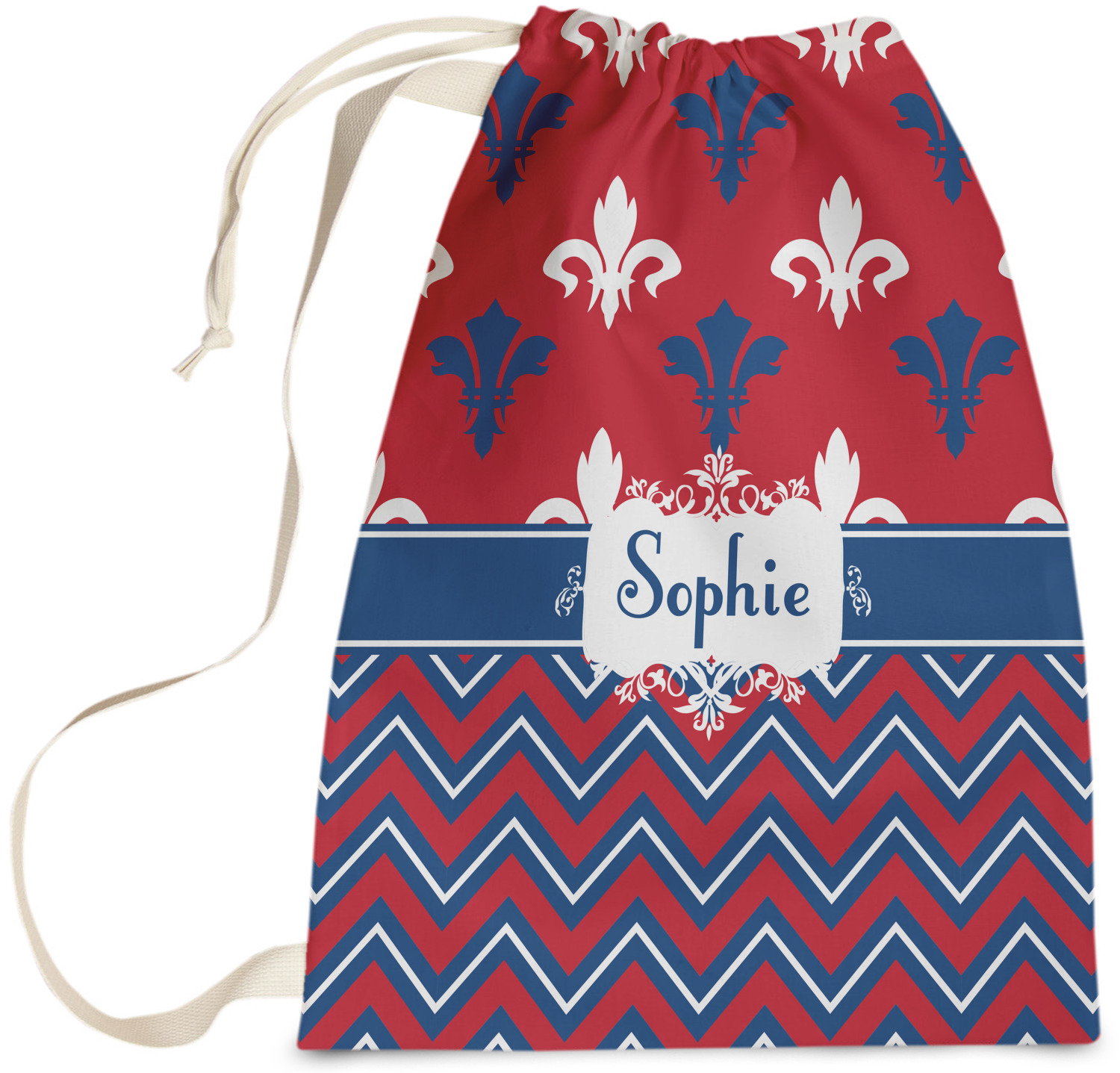 Carry your laundry in style with these customized laundry bags. Available in two sizes, featuring a natural colored woven strap and a cinch cord, these bags hold a lot of clothes or anything else you want to fit in them.