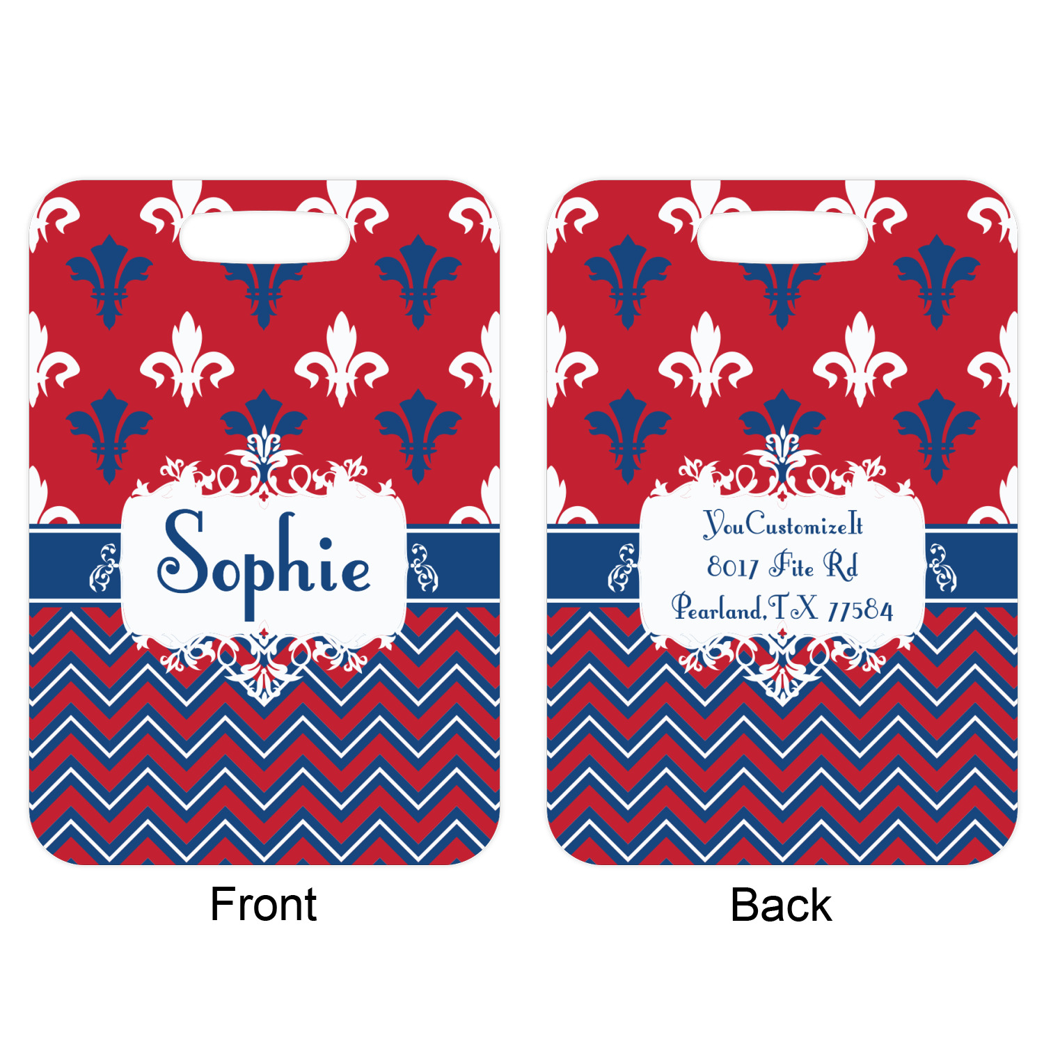 These metal luggage tags are printed on both sides; the front is printed with the design of your choice - and can be personalized with your name, name & initial or your monogram. The back can have as much or as little of your contact information as you desire - your name, your address, city, zip & state, you can also include your phone number and email address. Customize it exactly the way you want it!
