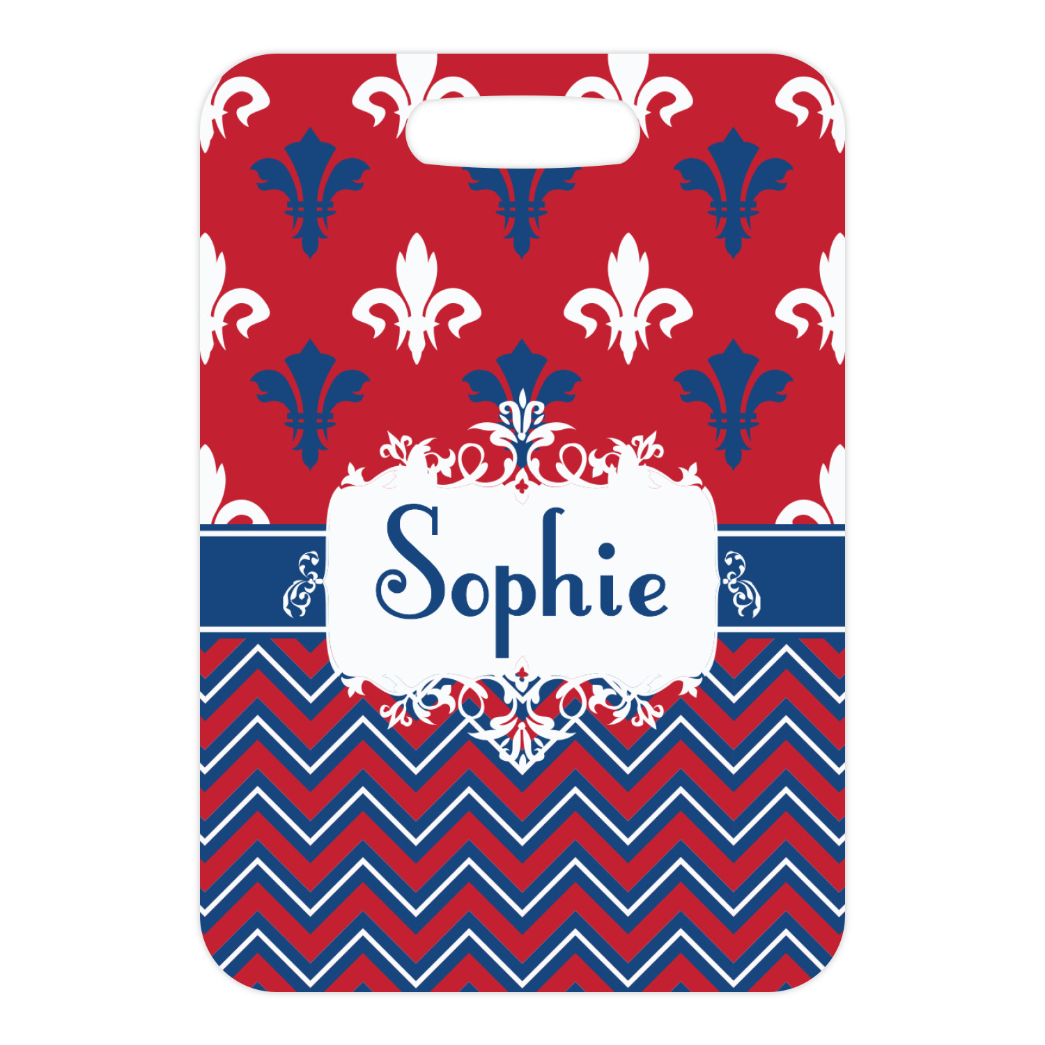 Remember the independence of our country with the Patriotic Fleur de Lis design. This design is a powerful combination of red, white, and blue. A chevron pattern nicely compliments the fleur de lis pattern with an elegant frame to hold your personalization.