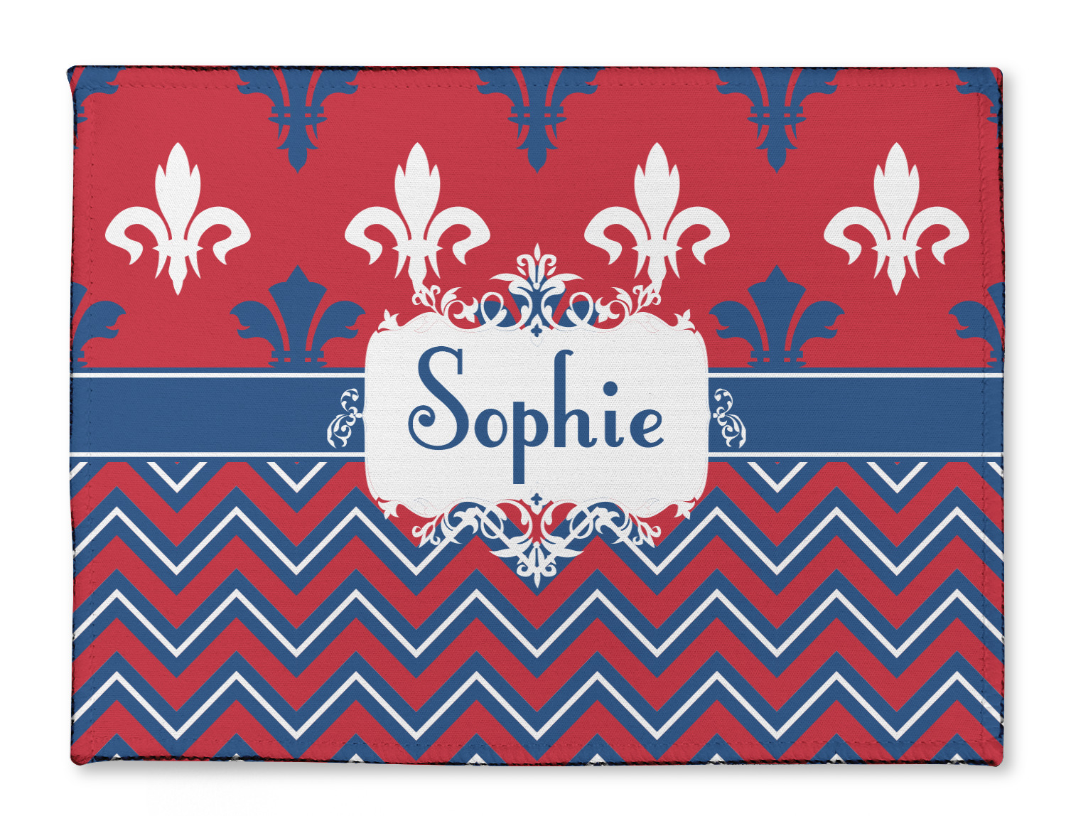 Remember the independence of our country with the Patriotic Fleur de Lis design. This design is a powerful combination of red, white, and blue. A chevron pattern nicely compliments the fleur de lis pattern with an elegant frame to hold your personalization.