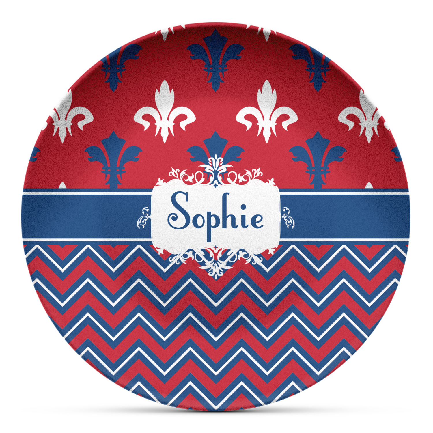 Remember the independence of our country with the Patriotic Fleur de Lis design. This design is a powerful combination of red, white, and blue. A chevron pattern nicely compliments the fleur de lis pattern with an elegant frame to hold your personalization.