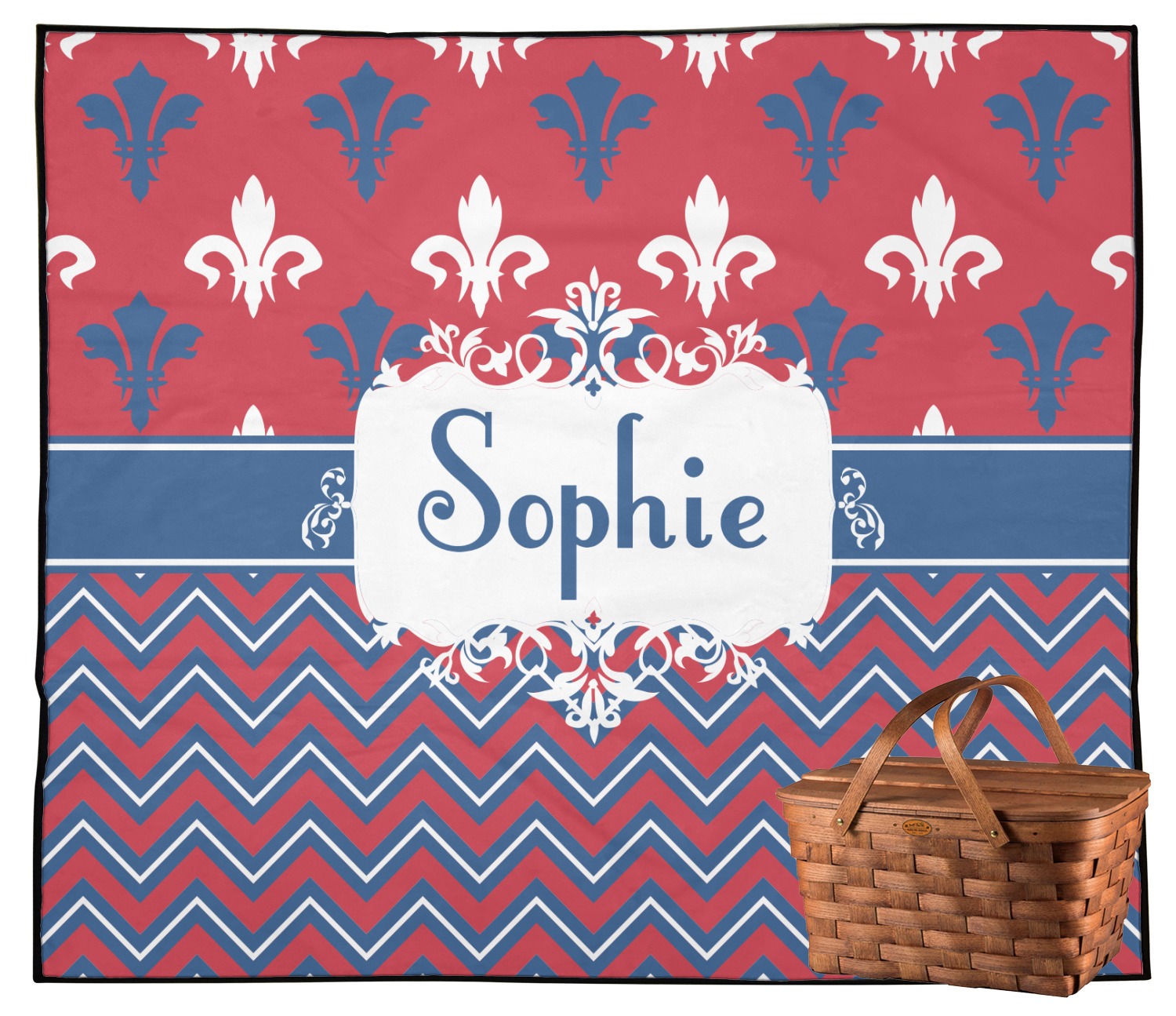 Remember the independence of our country with the Patriotic Fleur de Lis design. This design is a powerful combination of red, white, and blue. A chevron pattern nicely compliments the fleur de lis pattern with an elegant frame to hold your personalization.