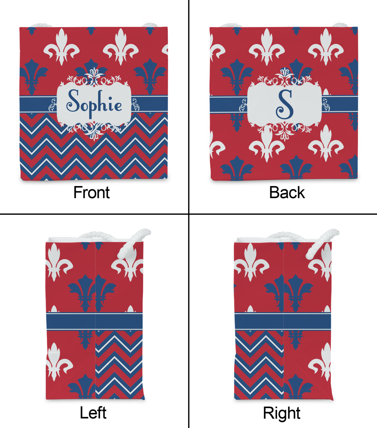 Remember the independence of our country with the Patriotic Fleur de Lis design. This design is a powerful combination of red, white, and blue. A chevron pattern nicely compliments the fleur de lis pattern with an elegant frame to hold your personalization.