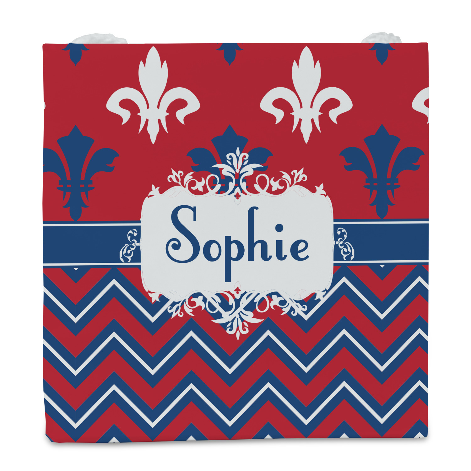 Remember the independence of our country with the Patriotic Fleur de Lis design. This design is a powerful combination of red, white, and blue. A chevron pattern nicely compliments the fleur de lis pattern with an elegant frame to hold your personalization.