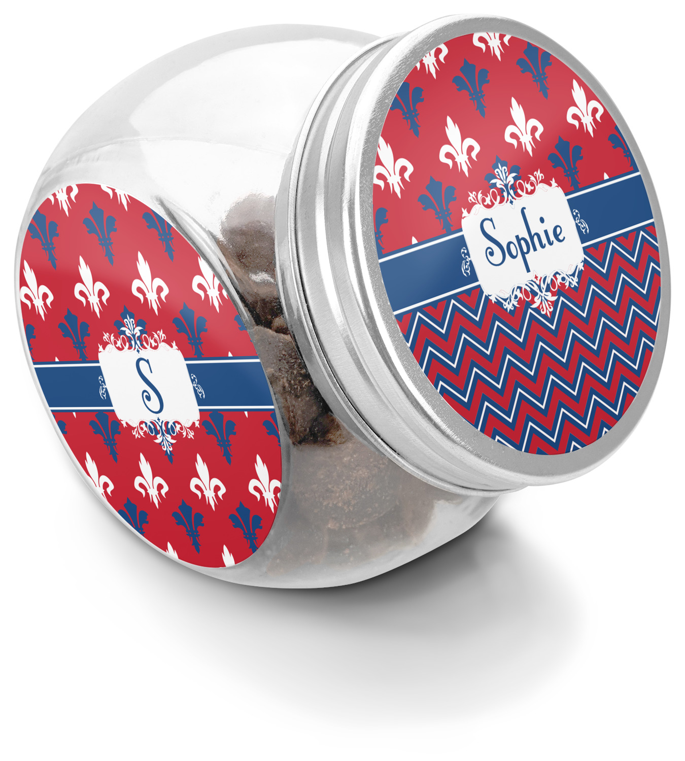 This treat jar is an excellent way to store treats for your favorite canine or feline. Moreover, their delicate, classy appearance makes them a tasteful addition to your countertop's décor. Crafted from clear glass, its unique construction and silver metal, screw-on lid allows for quick and easy access. Three, permanent, vinyl stickers are applied to both sides of the jar and lid, presenting your personalized design. The base of this glass, dog treat jar is 3.4" x 4.75", and the jar stands at 5" tall. Though on the smaller side, this jar is best suited for smaller treats or training treats.