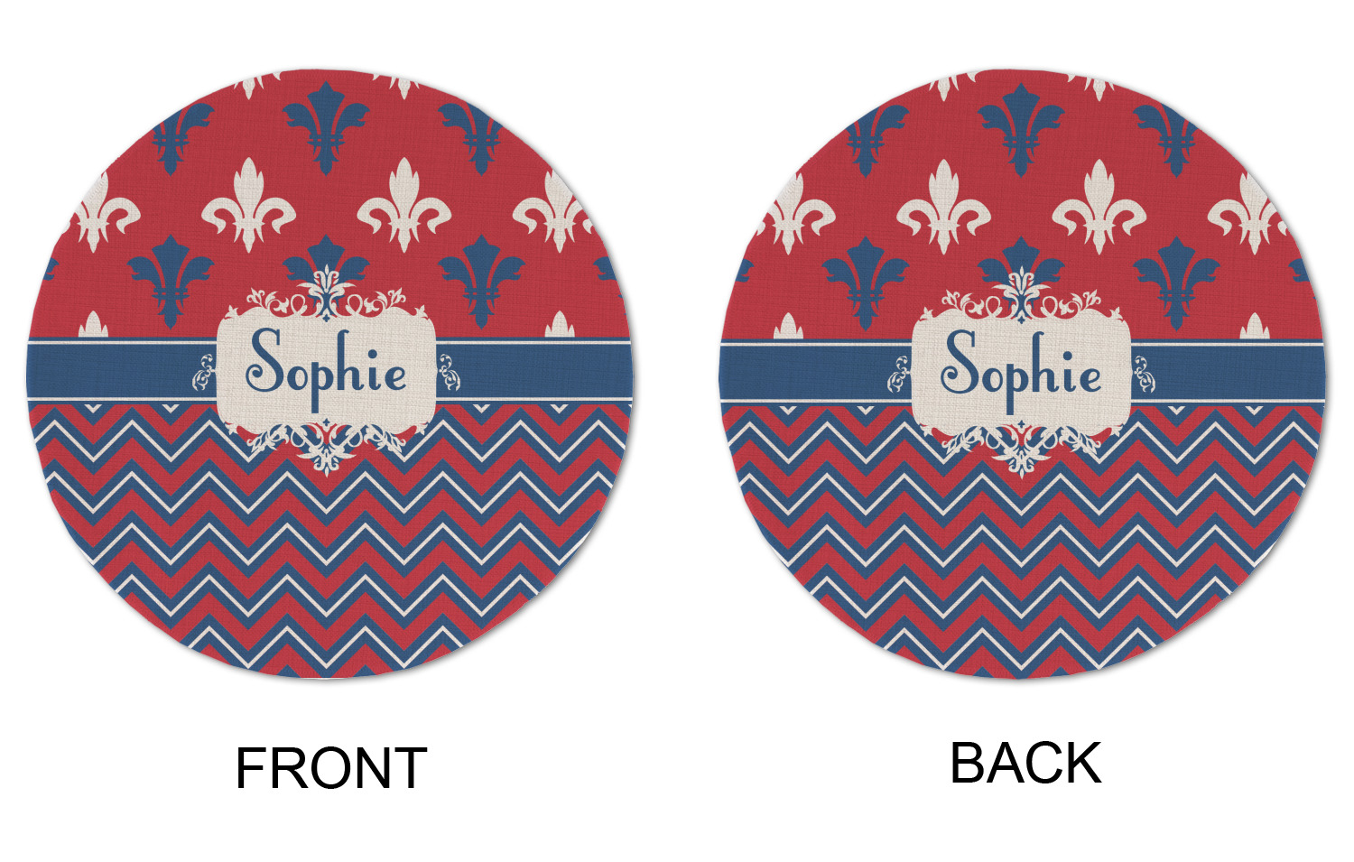 Remember the independence of our country with the Patriotic Fleur de Lis design. This design is a powerful combination of red, white, and blue. A chevron pattern nicely compliments the fleur de lis pattern with an elegant frame to hold your personalization.