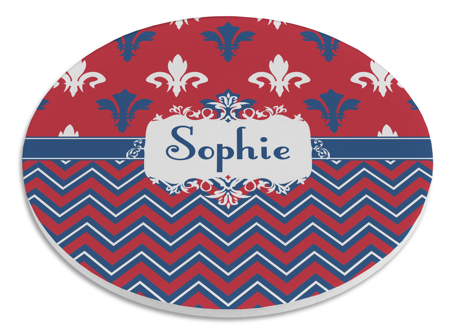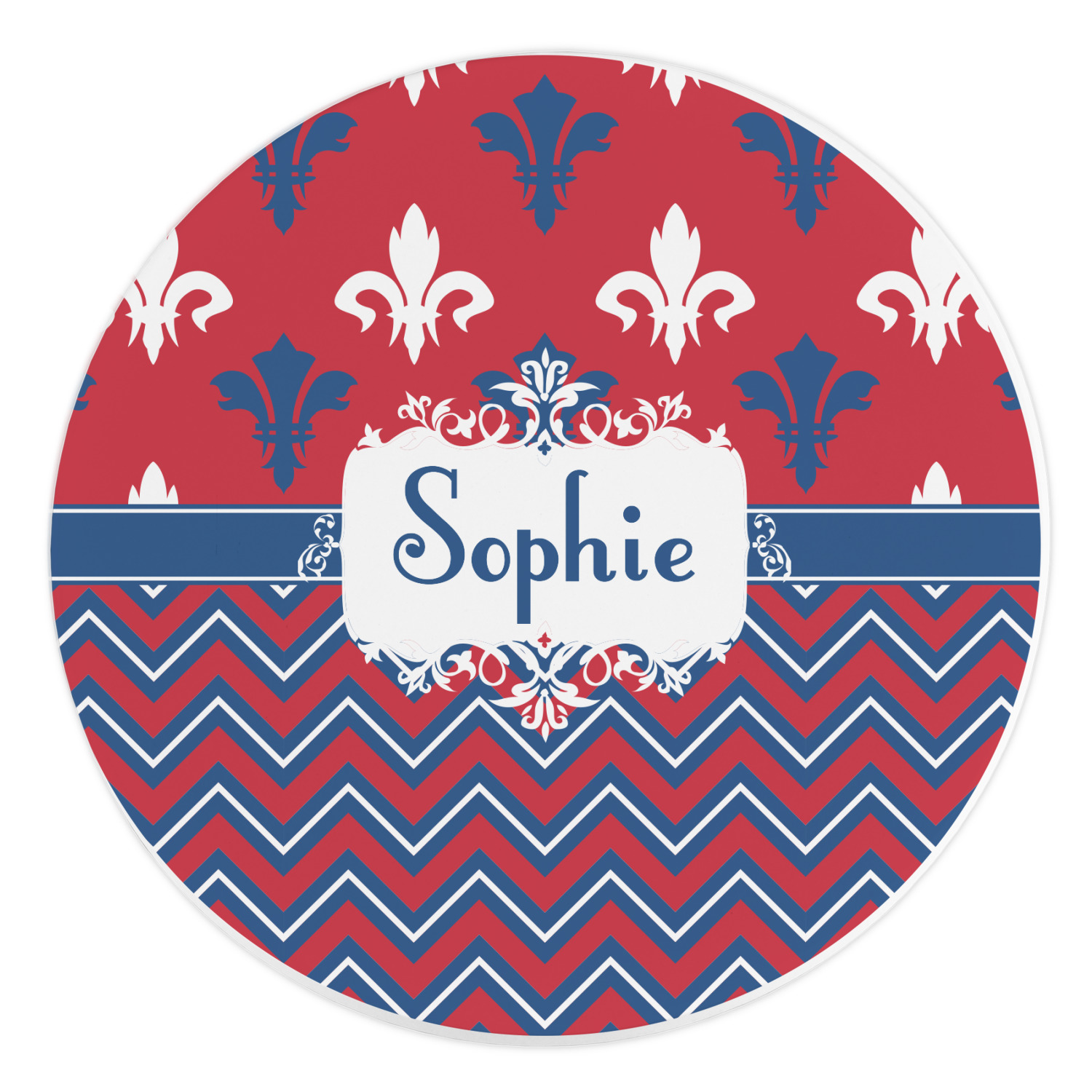 Remember the independence of our country with the Patriotic Fleur de Lis design. This design is a powerful combination of red, white, and blue. A chevron pattern nicely compliments the fleur de lis pattern with an elegant frame to hold your personalization.