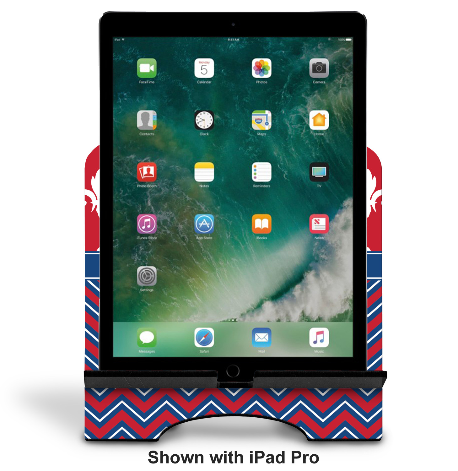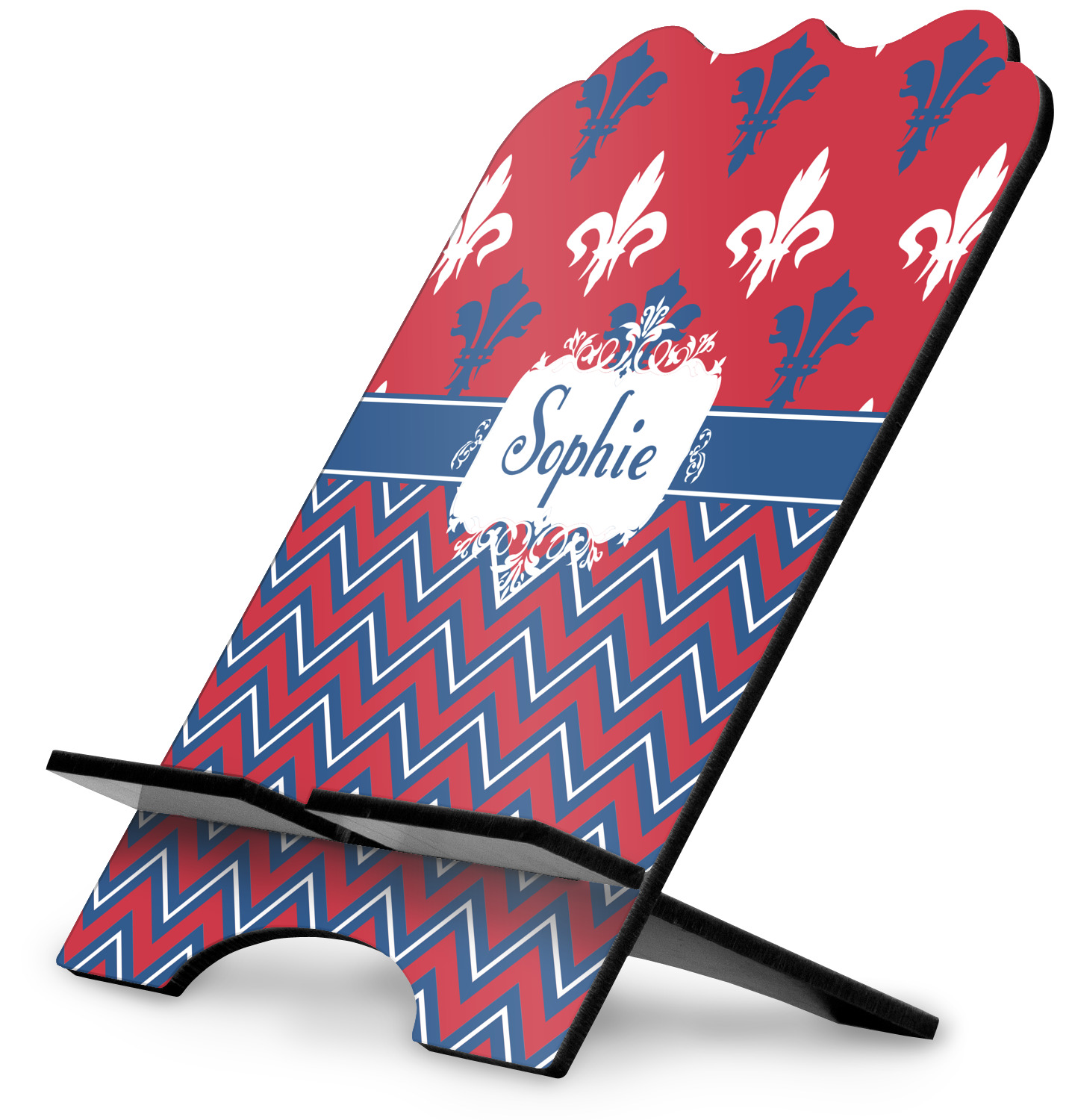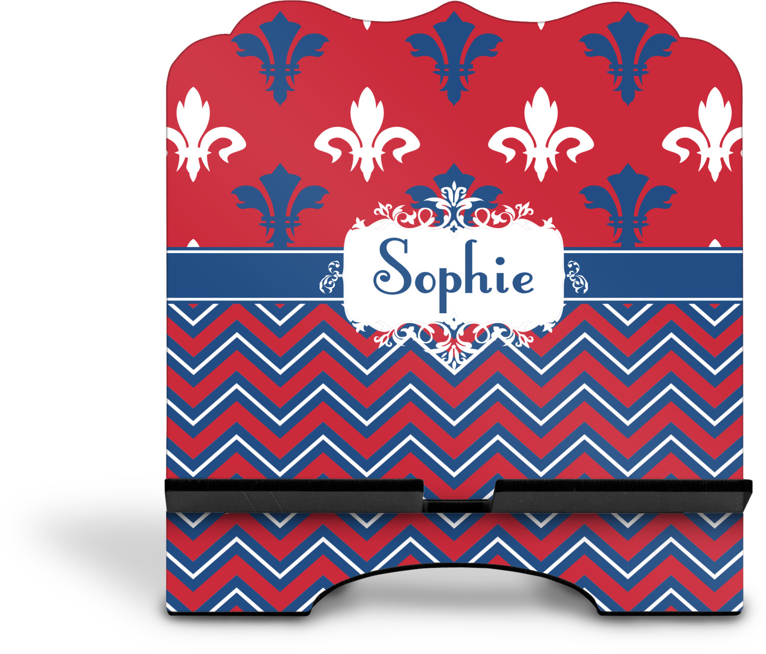 The stand is comprised of two hardboard pieces that fit snugly together and stabilize one another. The bottom part of the iPad stand supports your tablet, and has space for your tablets charger while in use. At 9.25" x 11.5", this tablet mount can support a device between the sizes of the iPad Pro and the iPad Mini 2. The uppermost part of the stand features a decorative, curved edge for a classy, suave appearance. We print your customization atop the face of the stand, in vibrant color. The remaining sides are colored a sleek black.