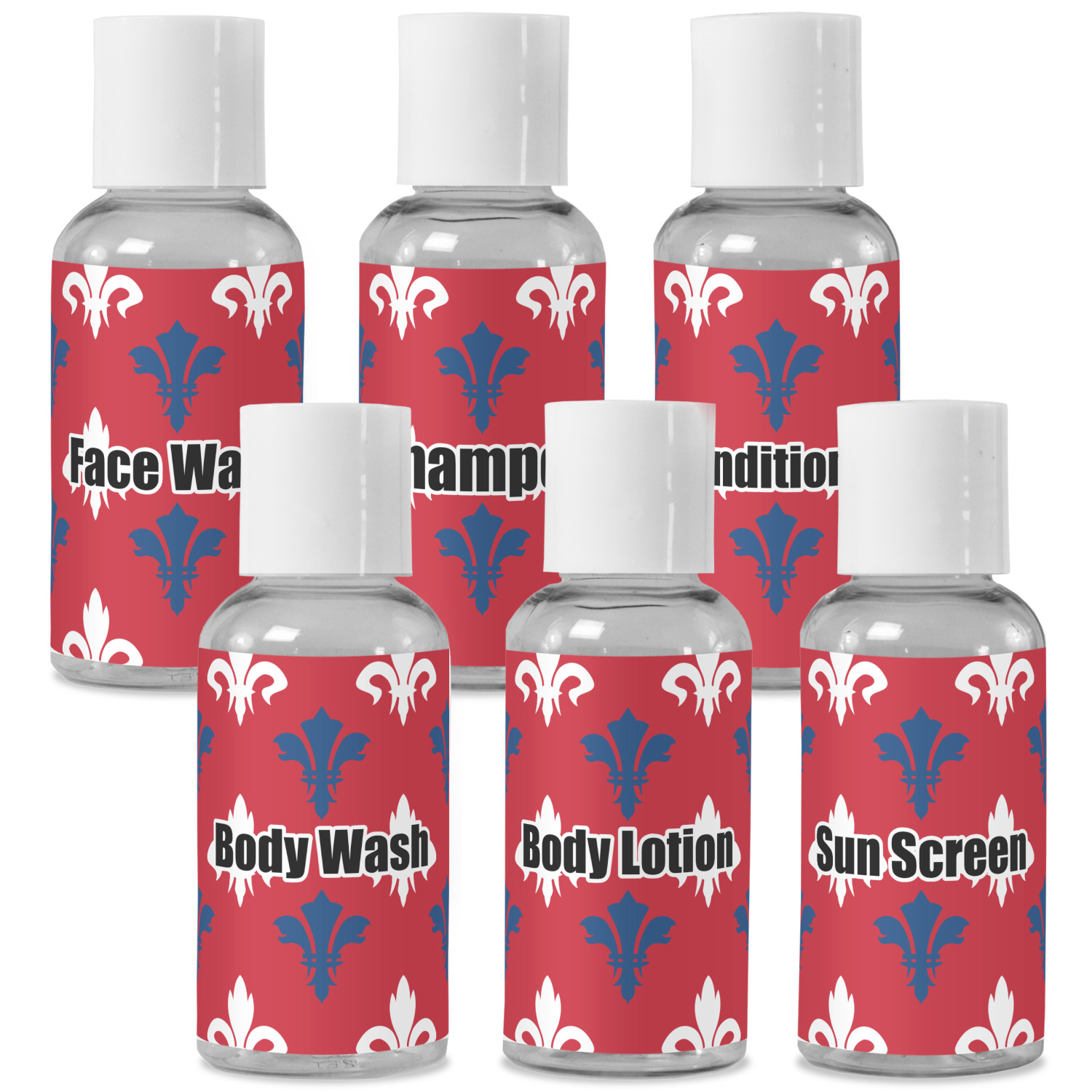 These soap and lotion travel bottles are the perfect place to start. Each set comes with 6 clear plastic bottles with white pop top lids. The bottles are cylindrical and can hold approximately 2.7oz. Perfect for plane travel!