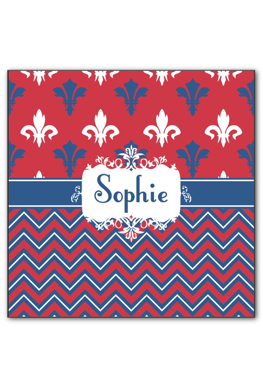 Remember the independence of our country with the Patriotic Fleur de Lis design. This design is a powerful combination of red, white, and blue. A chevron pattern nicely compliments the fleur de lis pattern with an elegant frame to hold your personalization.