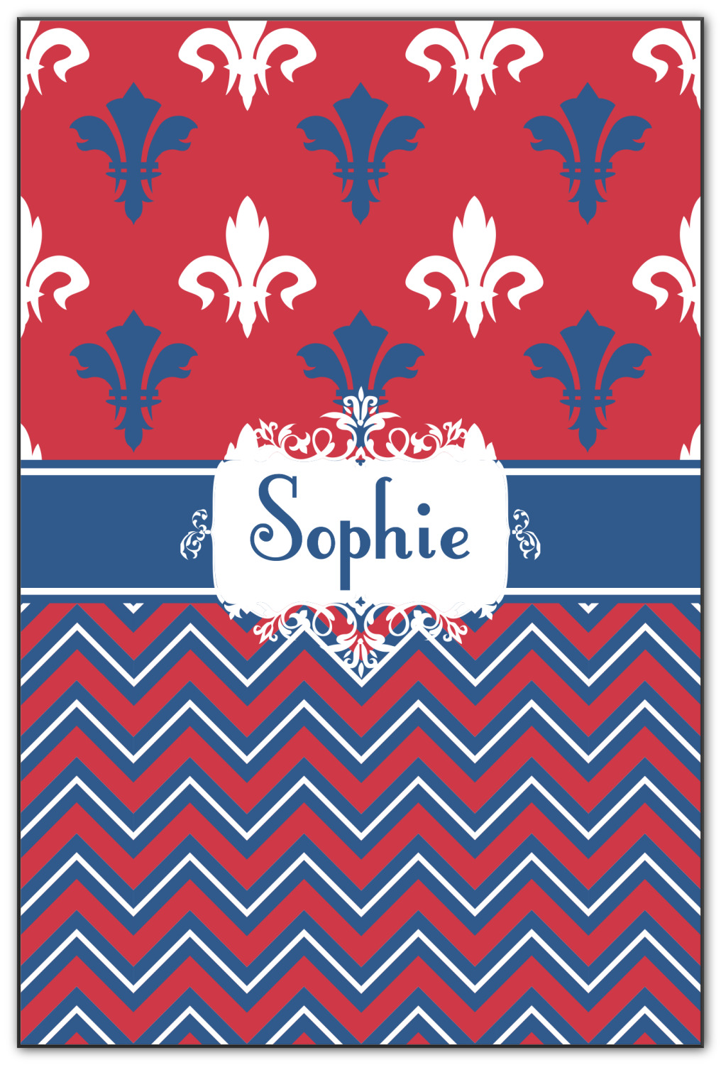 Remember the independence of our country with the Patriotic Fleur de Lis design. This design is a powerful combination of red, white, and blue. A chevron pattern nicely compliments the fleur de lis pattern with an elegant frame to hold your personalization.