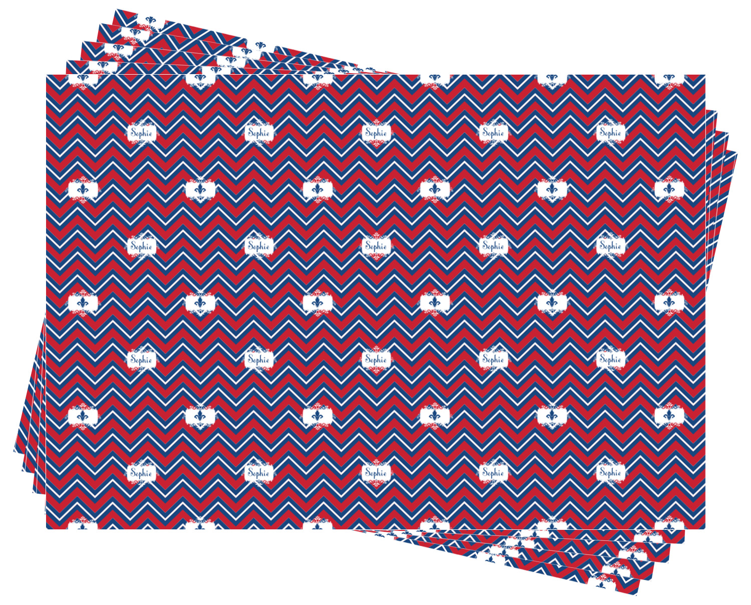 Remember the independence of our country with the Patriotic Fleur de Lis design. This design is a powerful combination of red, white, and blue. A chevron pattern nicely compliments the fleur de lis pattern with an elegant frame to hold your personalization.