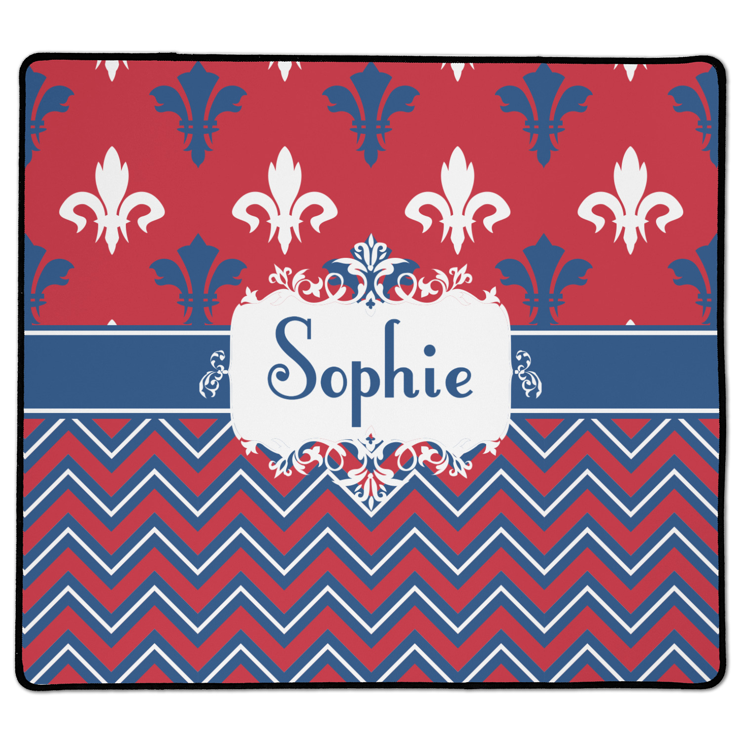 Remember the independence of our country with the Patriotic Fleur de Lis design. This design is a powerful combination of red, white, and blue. A chevron pattern nicely compliments the fleur de lis pattern with an elegant frame to hold your personalization.