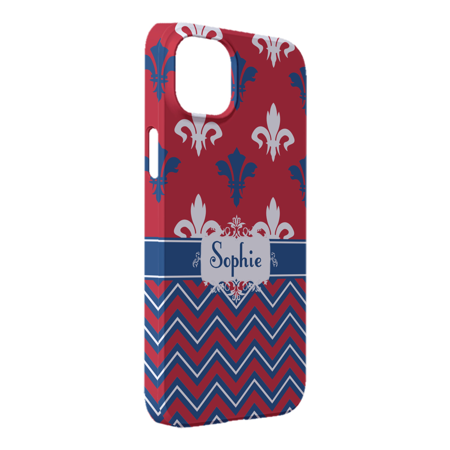 Remember the independence of our country with the Patriotic Fleur de Lis design. This design is a powerful combination of red, white, and blue. A chevron pattern nicely compliments the fleur de lis pattern with an elegant frame to hold your personalization.