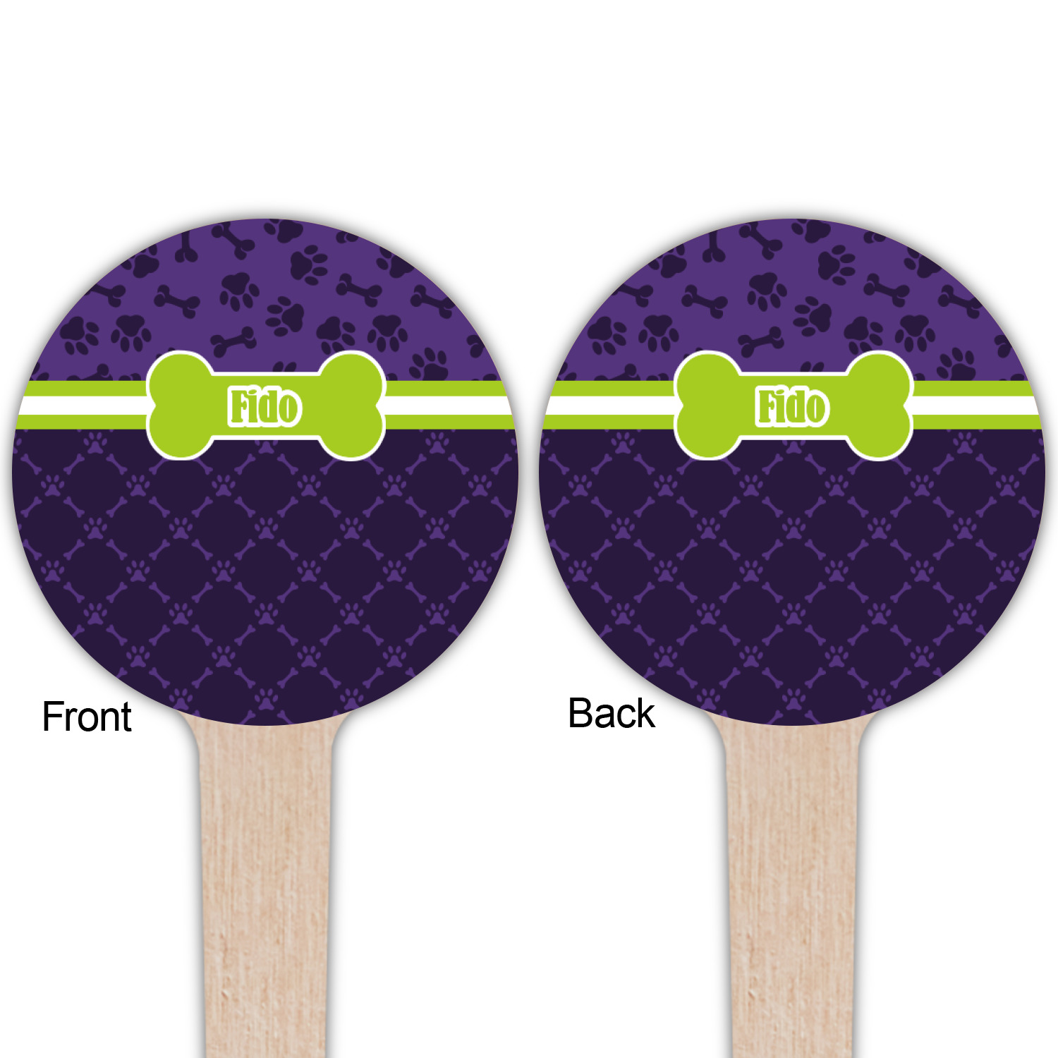 This design is a dark purple with light purple accents. It is divided into two different patterns that have bones and pawprints on them arranged in different ways. The dividing line, which is closer to the top, is made of a lime green and white ribbon. A label in the shape of a bone is on top with your pet's name right in the middle. The coordinating design has a fun sillhouette of a dog.