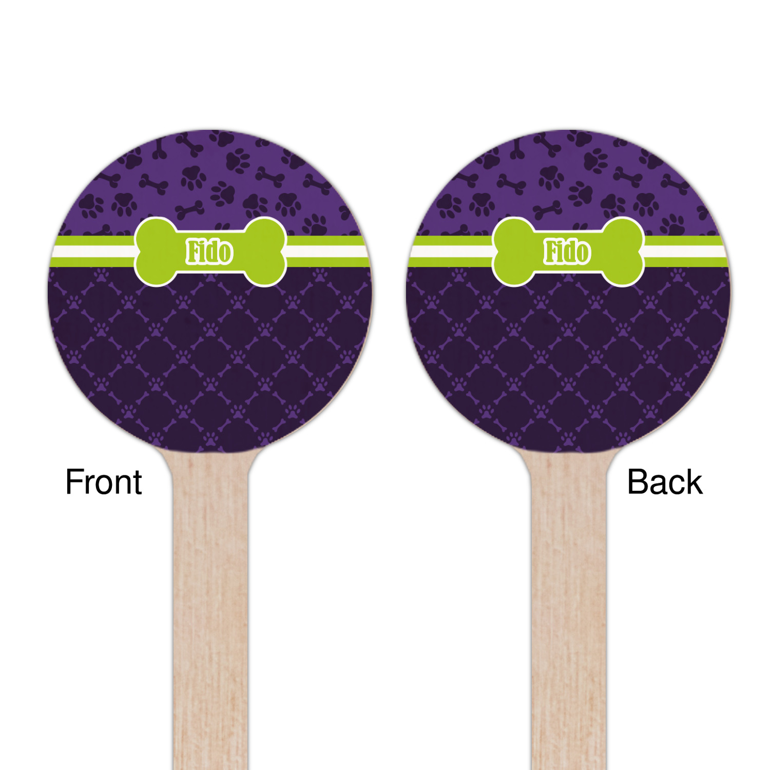 This design is a dark purple with light purple accents. It is divided into two different patterns that have bones and pawprints on them arranged in different ways. The dividing line, which is closer to the top, is made of a lime green and white ribbon. A label in the shape of a bone is on top with your pet's name right in the middle. The coordinating design has a fun sillhouette of a dog.