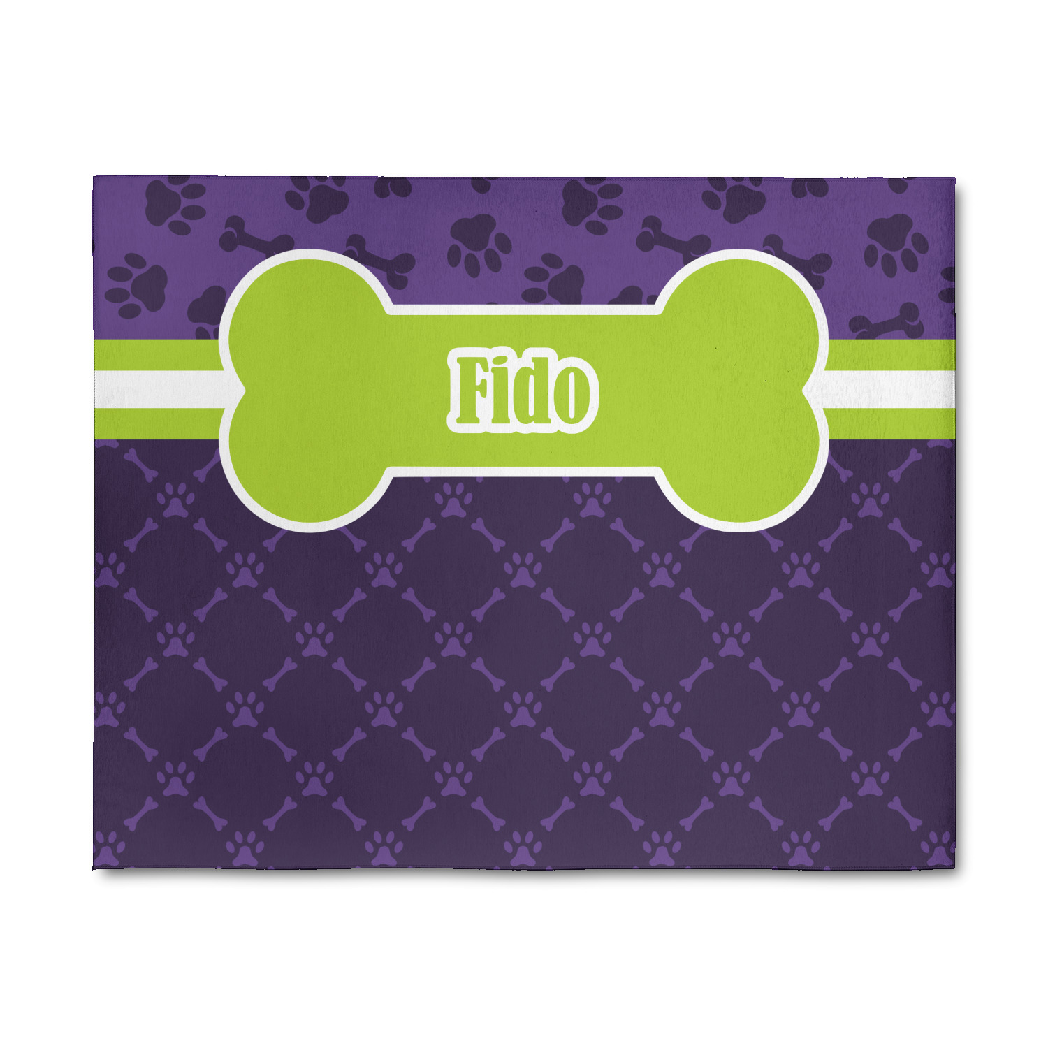 This design is a dark purple with light purple accents. It is divided into two different patterns that have bones and pawprints on them arranged in different ways. The dividing line, which is closer to the top, is made of a lime green and white ribbon. A label in the shape of a bone is on top with your pet's name right in the middle. The coordinating design has a fun sillhouette of a dog.