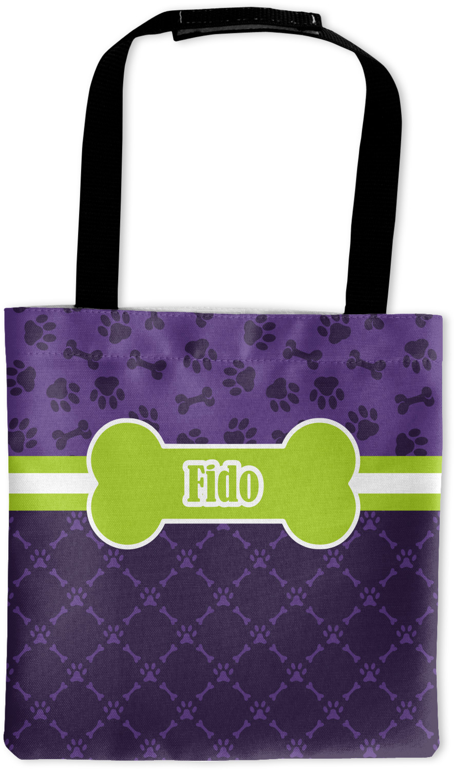This design is a dark purple with light purple accents. It is divided into two different patterns that have bones and pawprints on them arranged in different ways. The dividing line, which is closer to the top, is made of a lime green and white ribbon. A label in the shape of a bone is on top with your pet's name right in the middle. The coordinating design has a fun sillhouette of a dog.