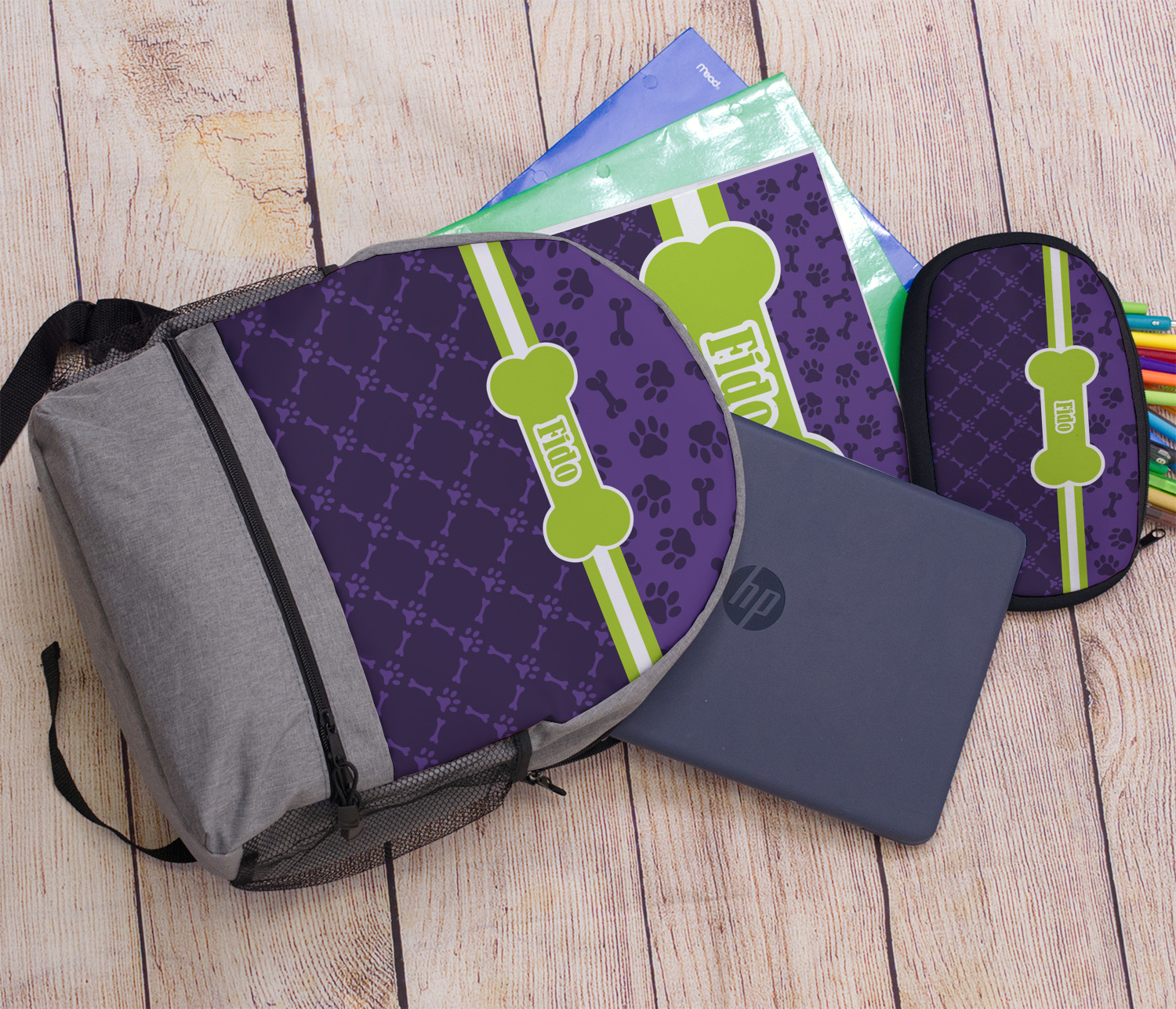 This design is a dark purple with light purple accents. It is divided into two different patterns that have bones and pawprints on them arranged in different ways. The dividing line, which is closer to the top, is made of a lime green and white ribbon. A label in the shape of a bone is on top with your pet's name right in the middle. The coordinating design has a fun sillhouette of a dog.
