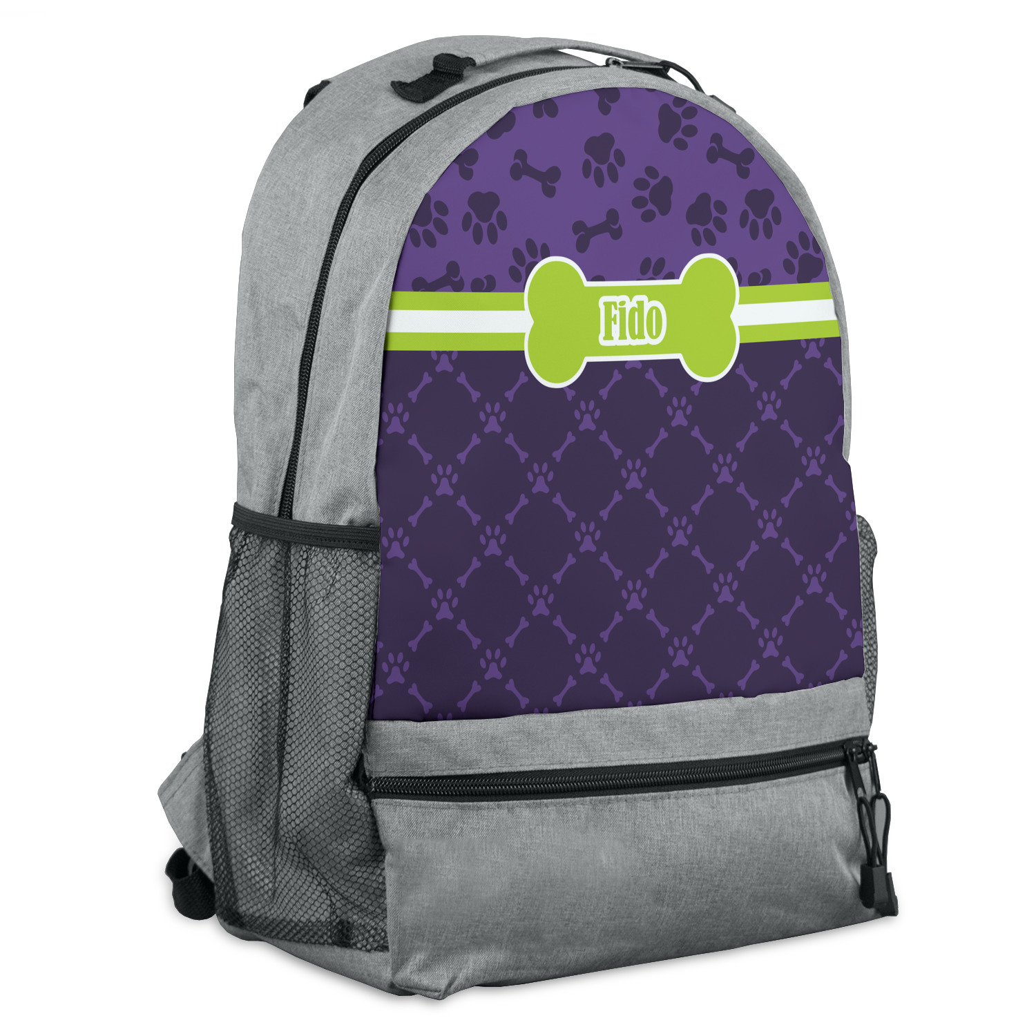 This design is a dark purple with light purple accents. It is divided into two different patterns that have bones and pawprints on them arranged in different ways. The dividing line, which is closer to the top, is made of a lime green and white ribbon. A label in the shape of a bone is on top with your pet's name right in the middle. The coordinating design has a fun sillhouette of a dog.