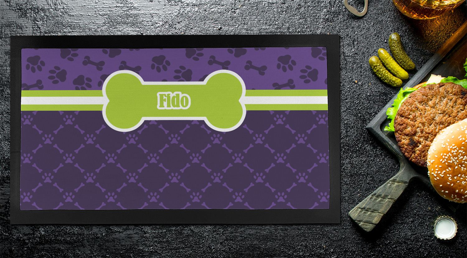 This design is a dark purple with light purple accents. It is divided into two different patterns that have bones and pawprints on them arranged in different ways. The dividing line, which is closer to the top, is made of a lime green and white ribbon. A label in the shape of a bone is on top with your pet's name right in the middle. The coordinating design has a fun sillhouette of a dog.