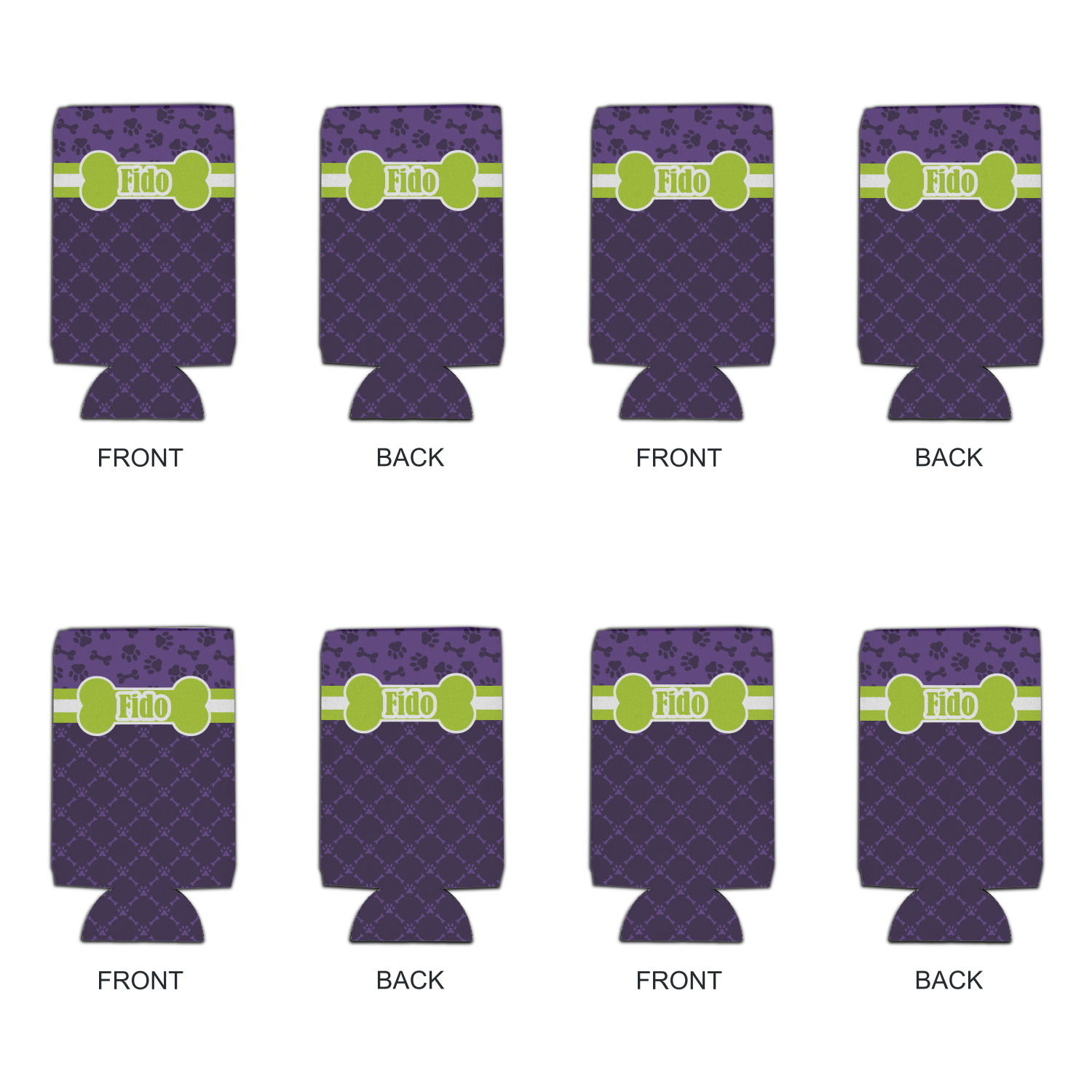 This design is a dark purple with light purple accents. It is divided into two different patterns that have bones and pawprints on them arranged in different ways. The dividing line, which is closer to the top, is made of a lime green and white ribbon. A label in the shape of a bone is on top with your pet's name right in the middle. The coordinating design has a fun sillhouette of a dog.