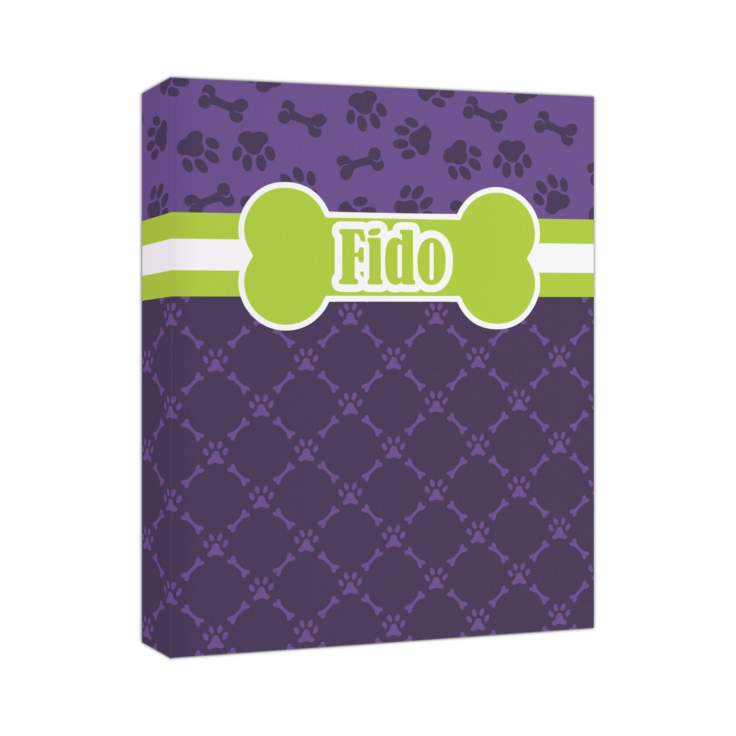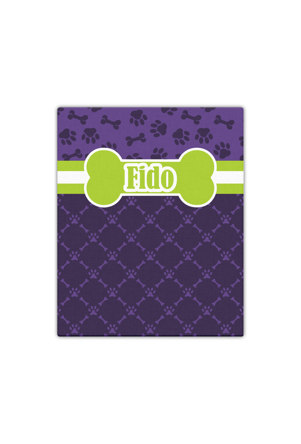 This design is a dark purple with light purple accents. It is divided into two different patterns that have bones and pawprints on them arranged in different ways. The dividing line, which is closer to the top, is made of a lime green and white ribbon. A label in the shape of a bone is on top with your pet's name right in the middle. The coordinating design has a fun sillhouette of a dog.