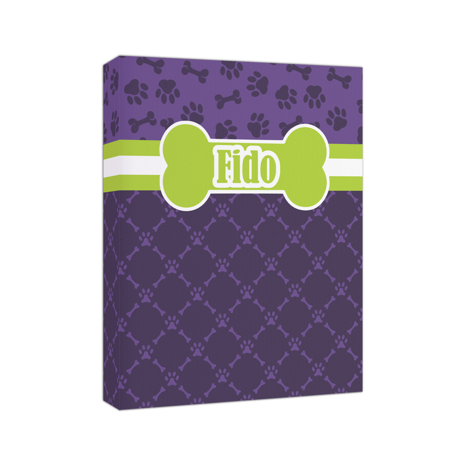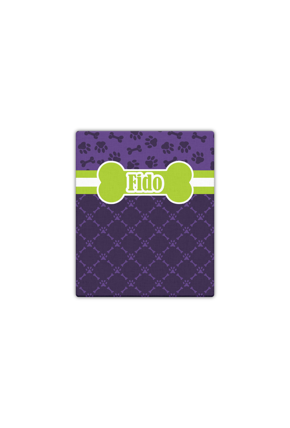 This design is a dark purple with light purple accents. It is divided into two different patterns that have bones and pawprints on them arranged in different ways. The dividing line, which is closer to the top, is made of a lime green and white ribbon. A label in the shape of a bone is on top with your pet's name right in the middle. The coordinating design has a fun sillhouette of a dog.