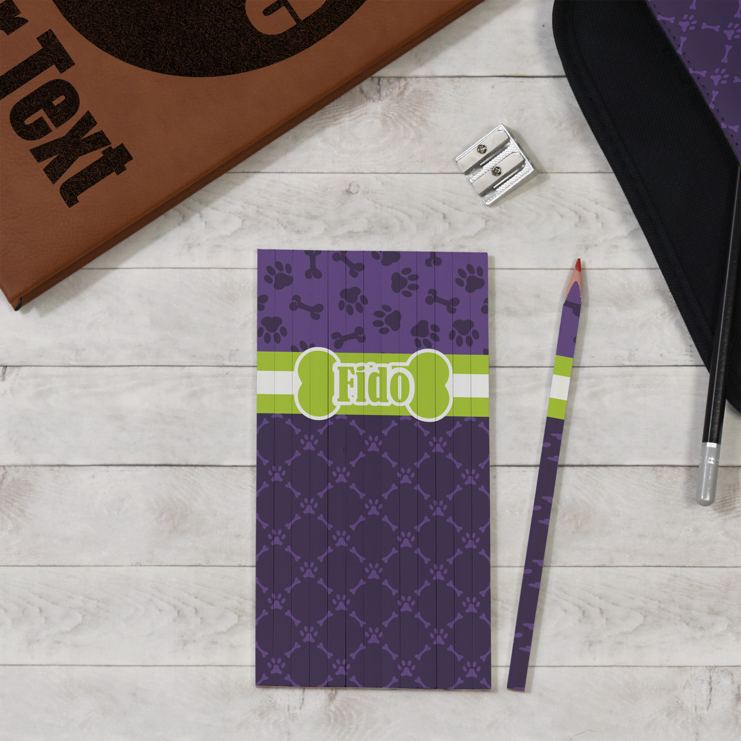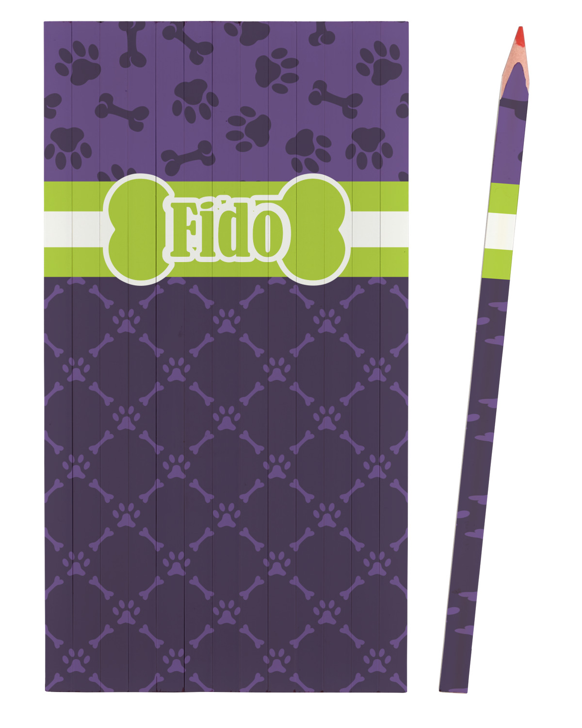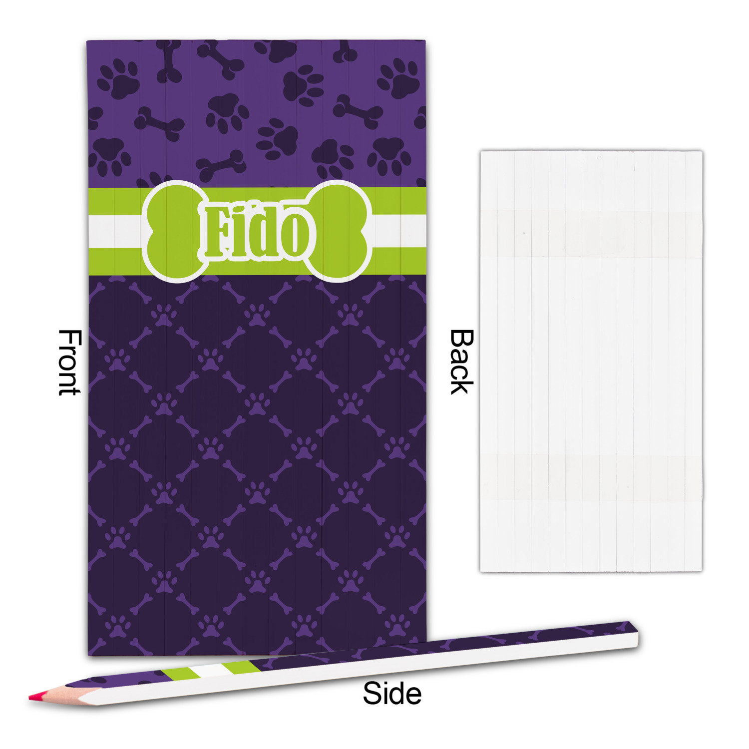 This design is a dark purple with light purple accents. It is divided into two different patterns that have bones and pawprints on them arranged in different ways. The dividing line, which is closer to the top, is made of a lime green and white ribbon. A label in the shape of a bone is on top with your pet's name right in the middle. The coordinating design has a fun sillhouette of a dog.