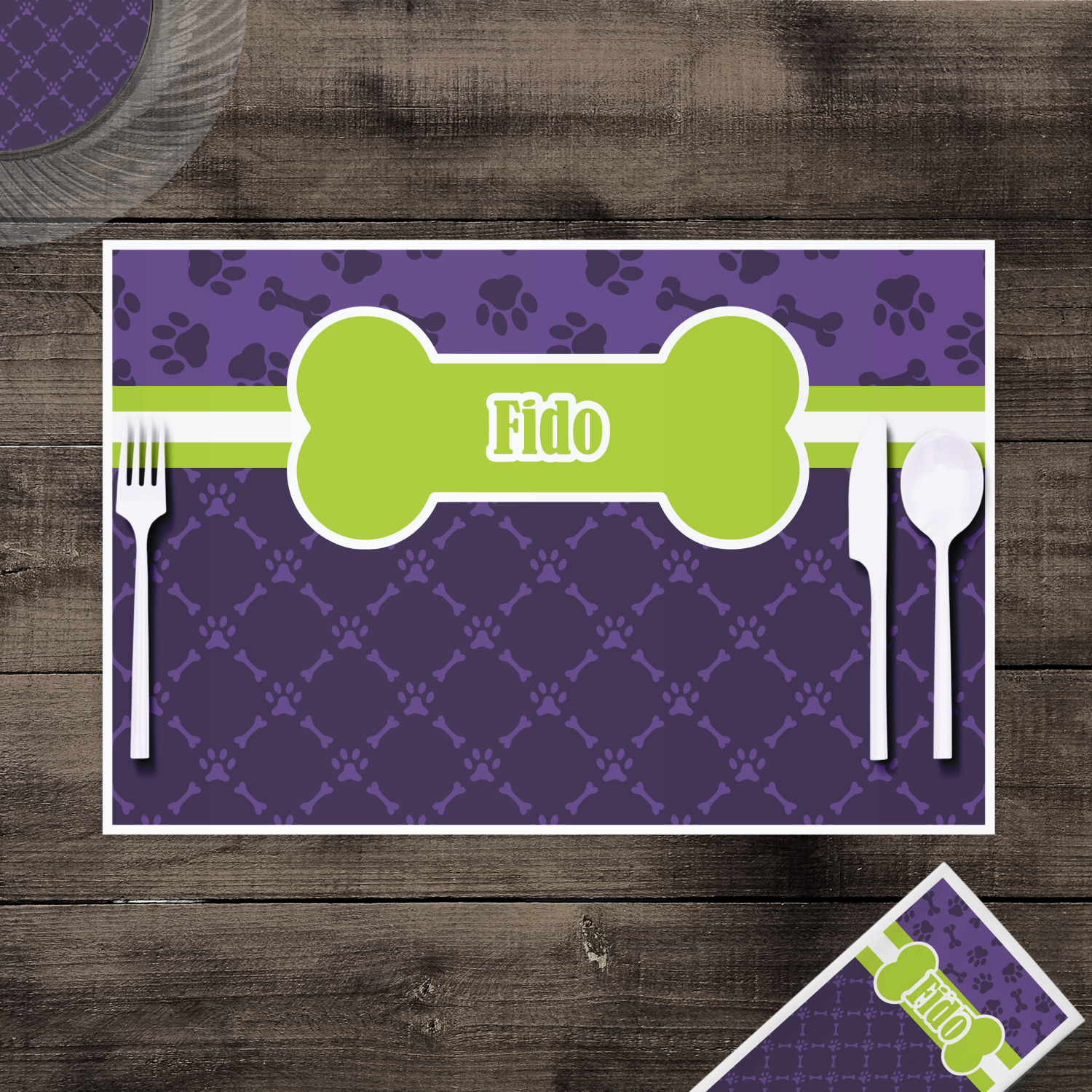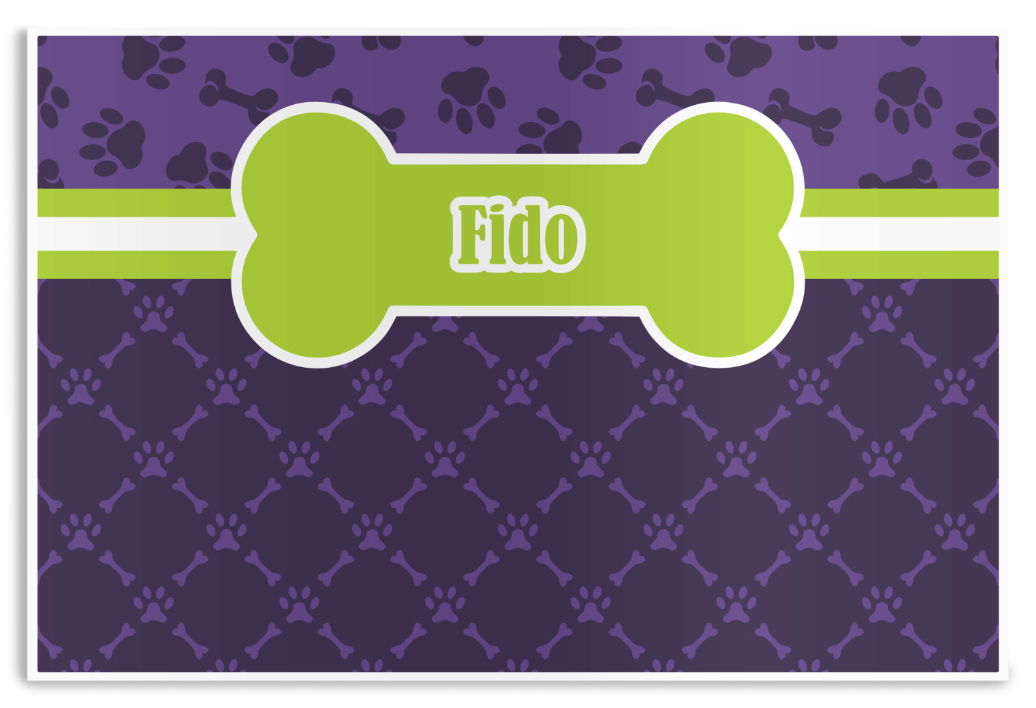 This design is a dark purple with light purple accents. It is divided into two different patterns that have bones and pawprints on them arranged in different ways. The dividing line, which is closer to the top, is made of a lime green and white ribbon. A label in the shape of a bone is on top with your pet's name right in the middle. The coordinating design has a fun sillhouette of a dog.